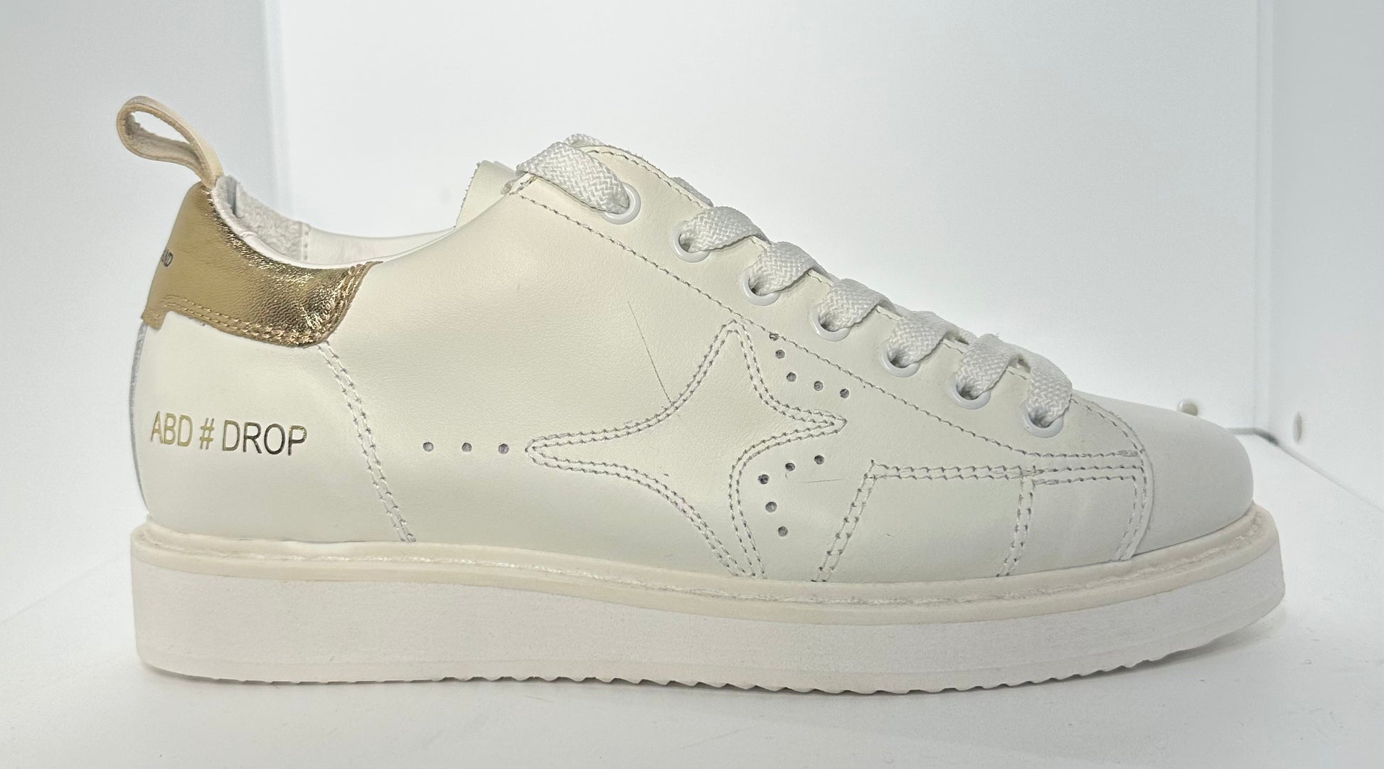 La Drop 2739 di Ama-Brand è la sneaker perfetta per chi ricerca uno stile essenziale senza rinunciare a un dettaglio prezioso. Questa calzatura "Made in Italy" combina la purezza della pelle bianca con rifiniture laminate, creando un equilibrio ideale tra sportività e raffinatezza urbana.