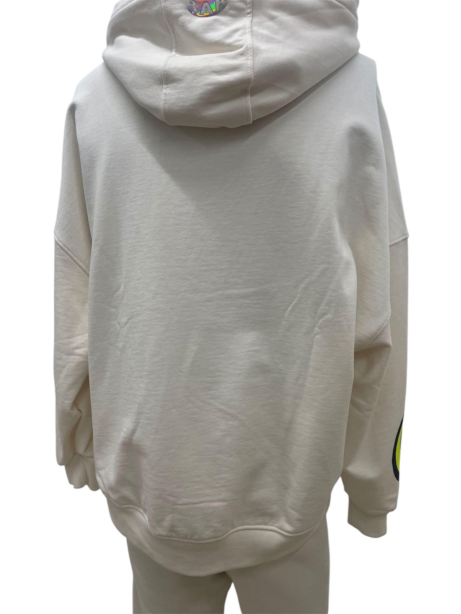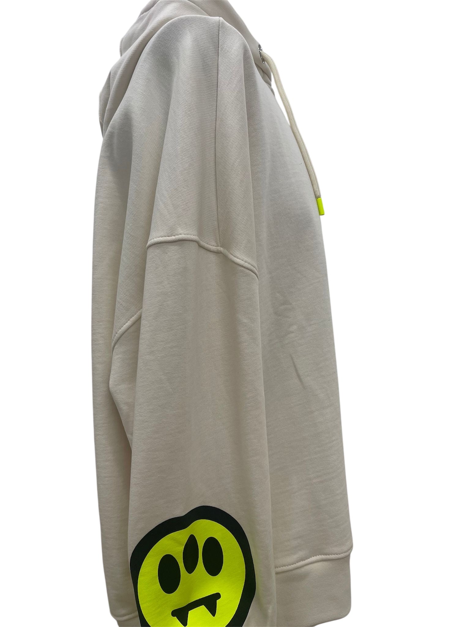 Felpa con cappuccio Barrow in morbido cotone bianco. Modello oversize con coulisse regolabili e finalini fluo a contrasto. Logo Barrow stampato sul petto e maxi stampa smile giallo fluorescente sulla manica sinistra.