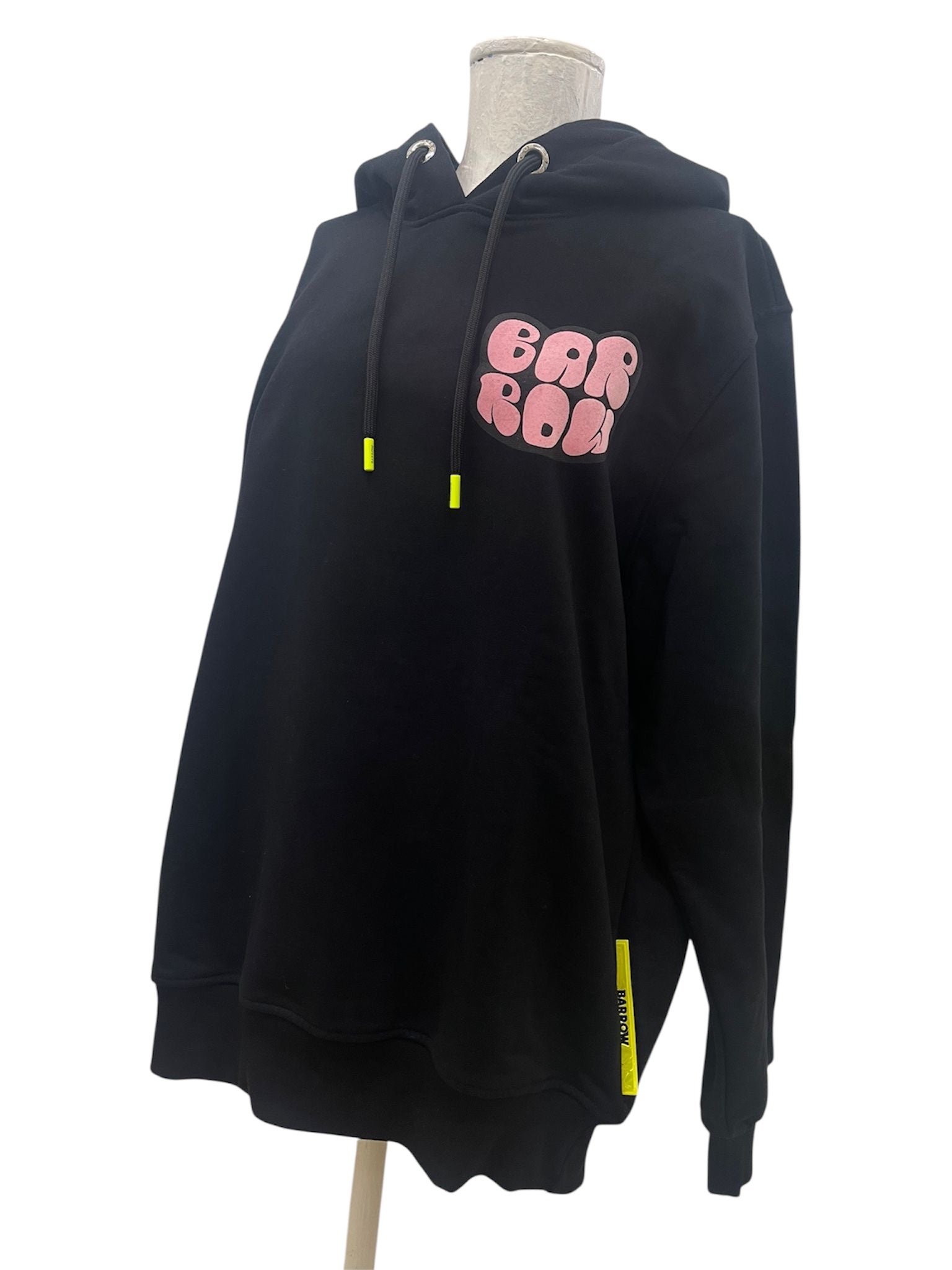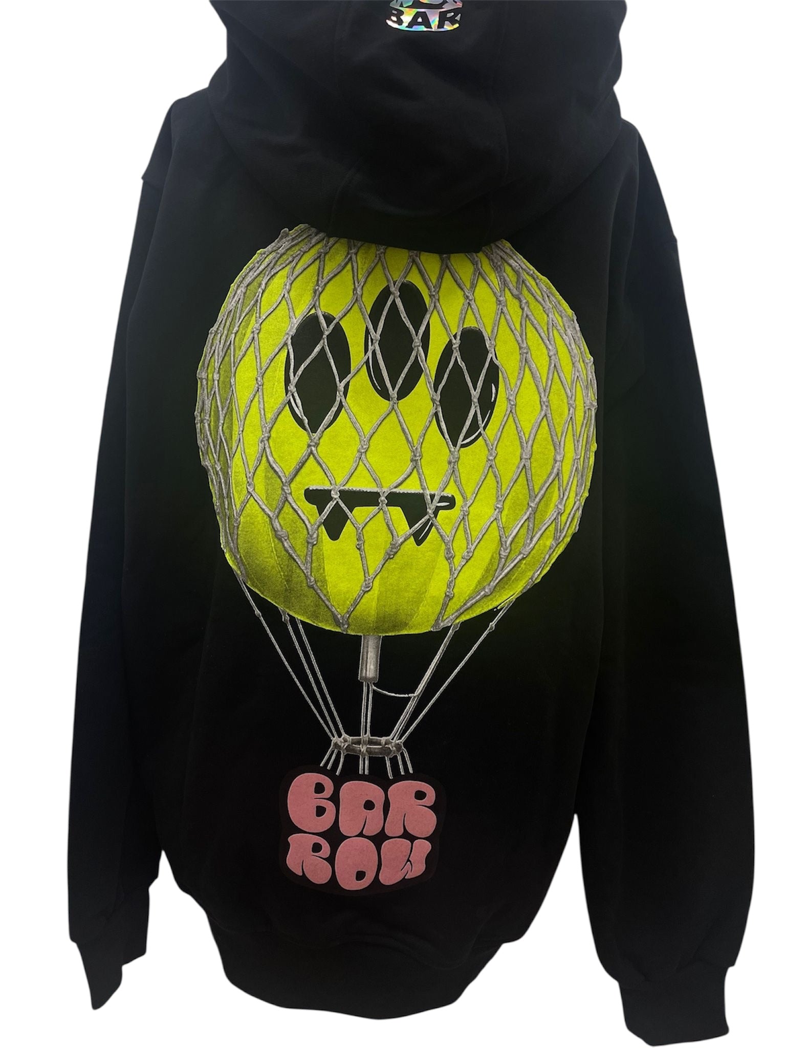 Felpa con cappuccio in cotone nero firmata Barrow, caratterizzata da uno stile streetwear distintivo. Sul fronte è presente la scritta Barrow in rosa con grafica bold, mentre il retro è arricchito da una grande stampa di palloncino a mongolfiera con il classico smiley giallo del brand, protetto da una rete a effetto 3D.