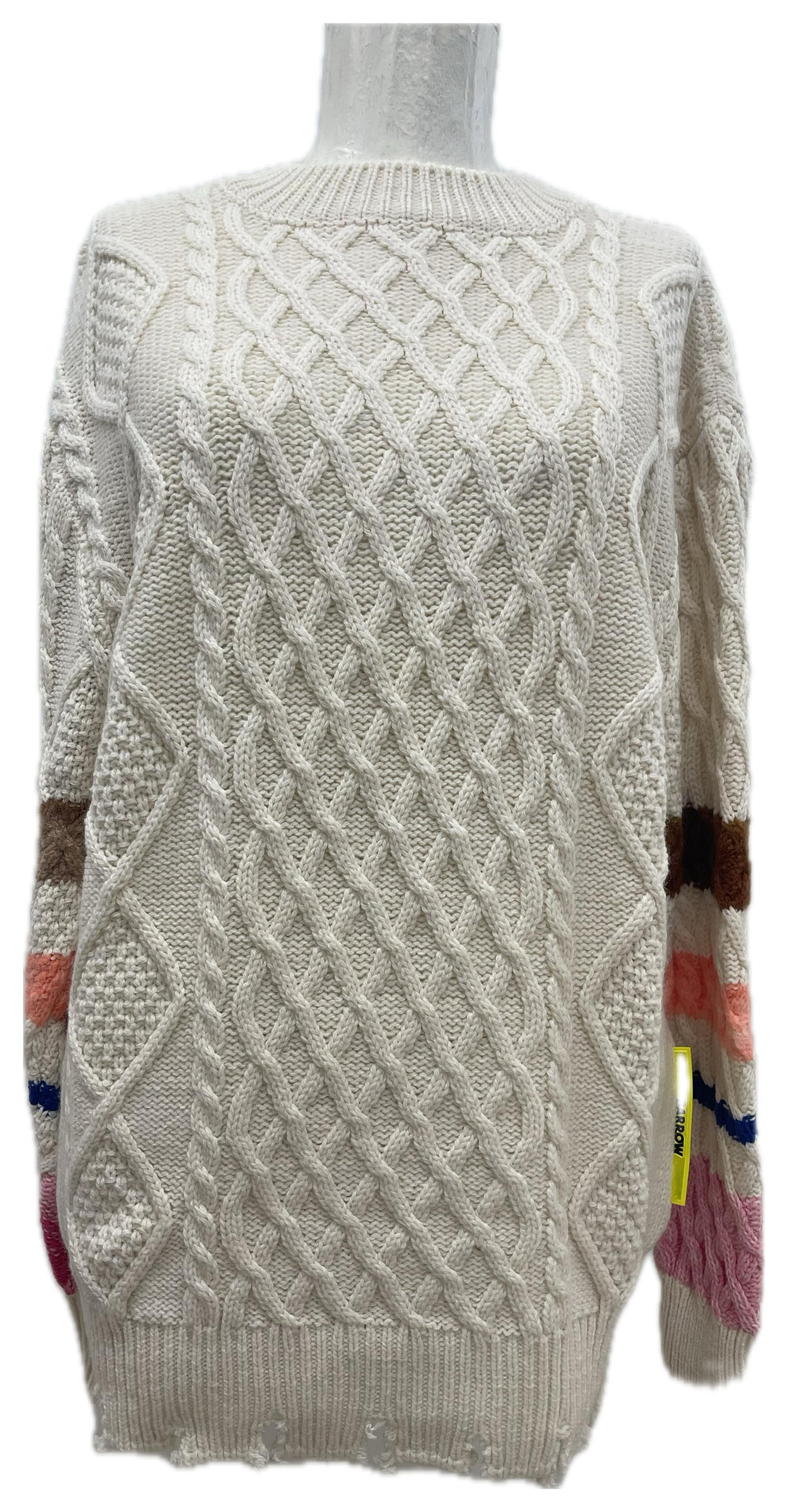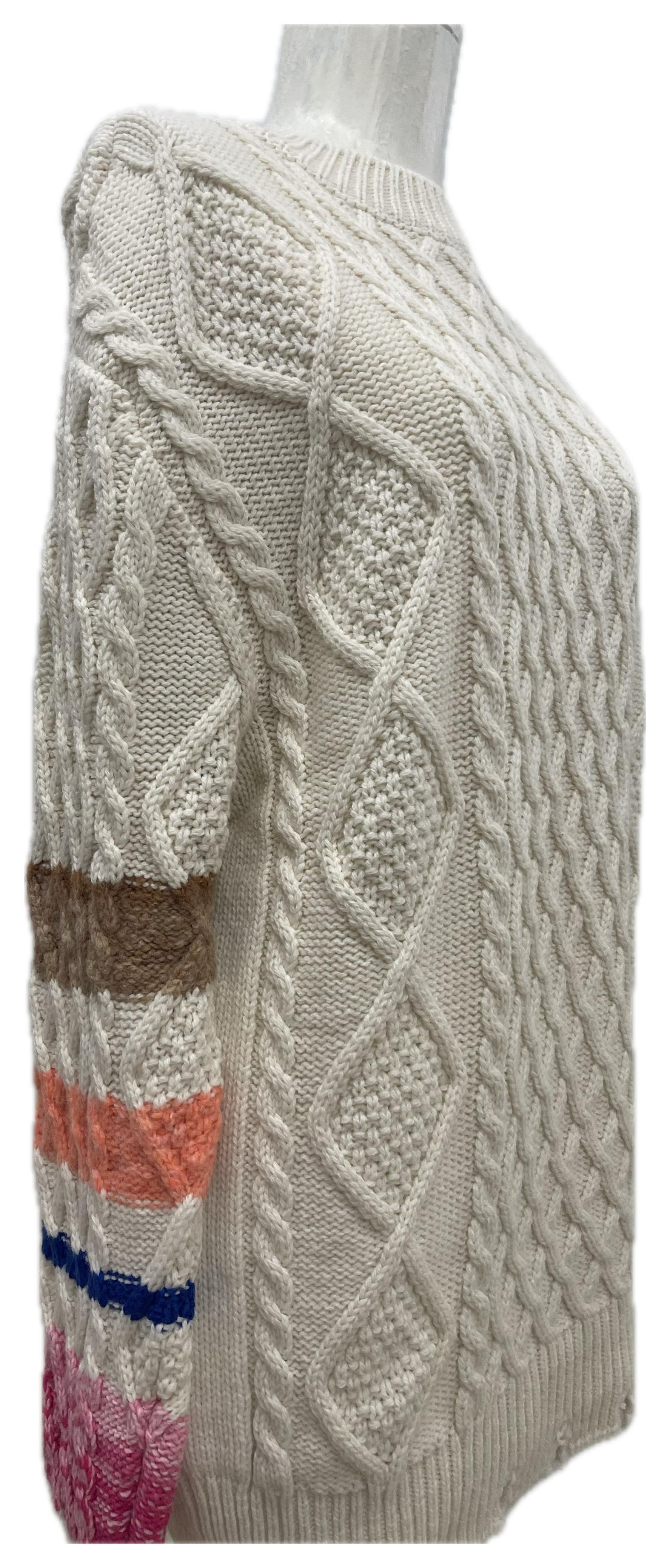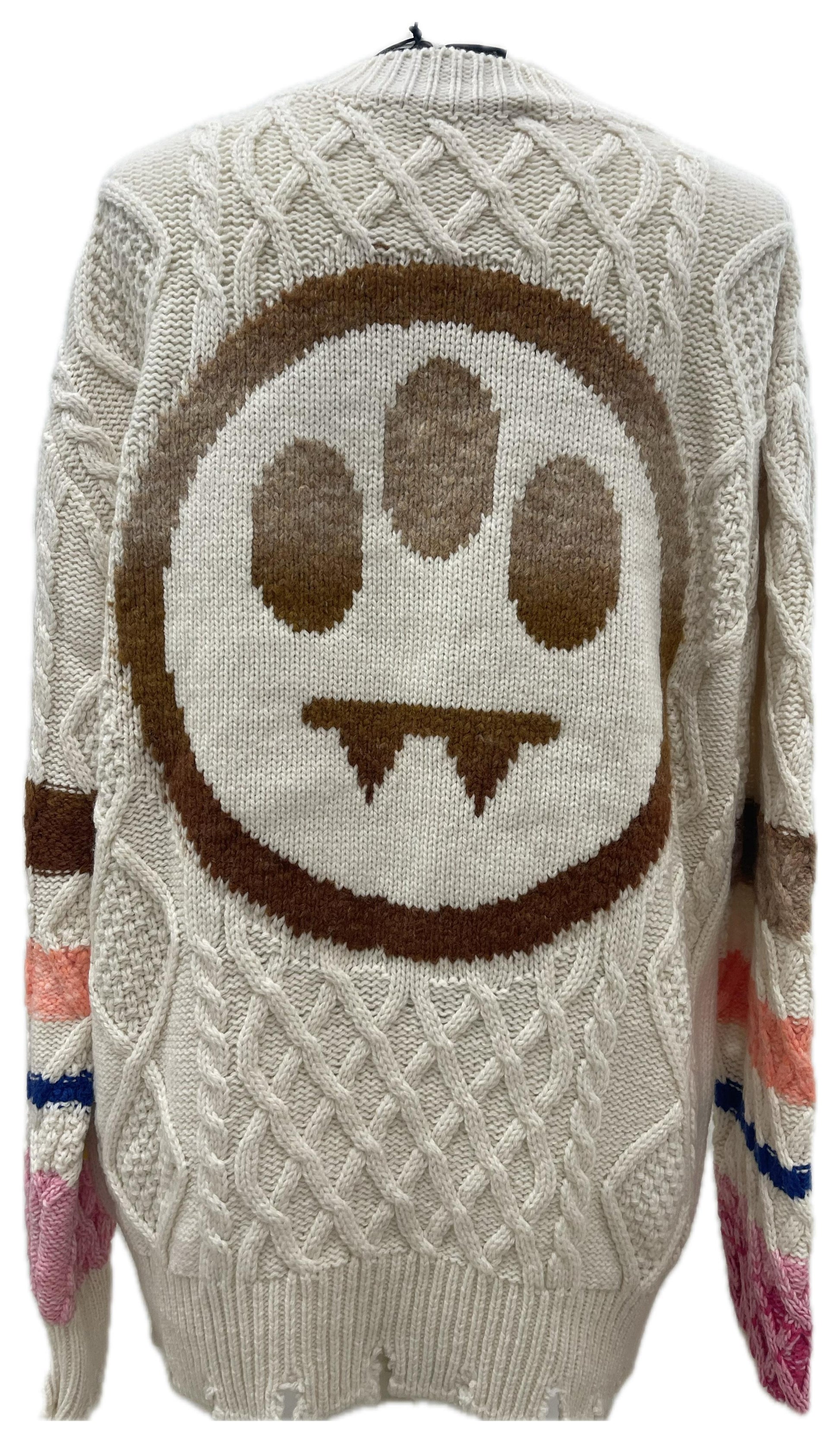 Maglione panna a lavorazione a trecce con maniche a blocchi multicolor e maxi smiley Barrow lavorato sul retro. Caldo, scenografico e facile da abbinare.