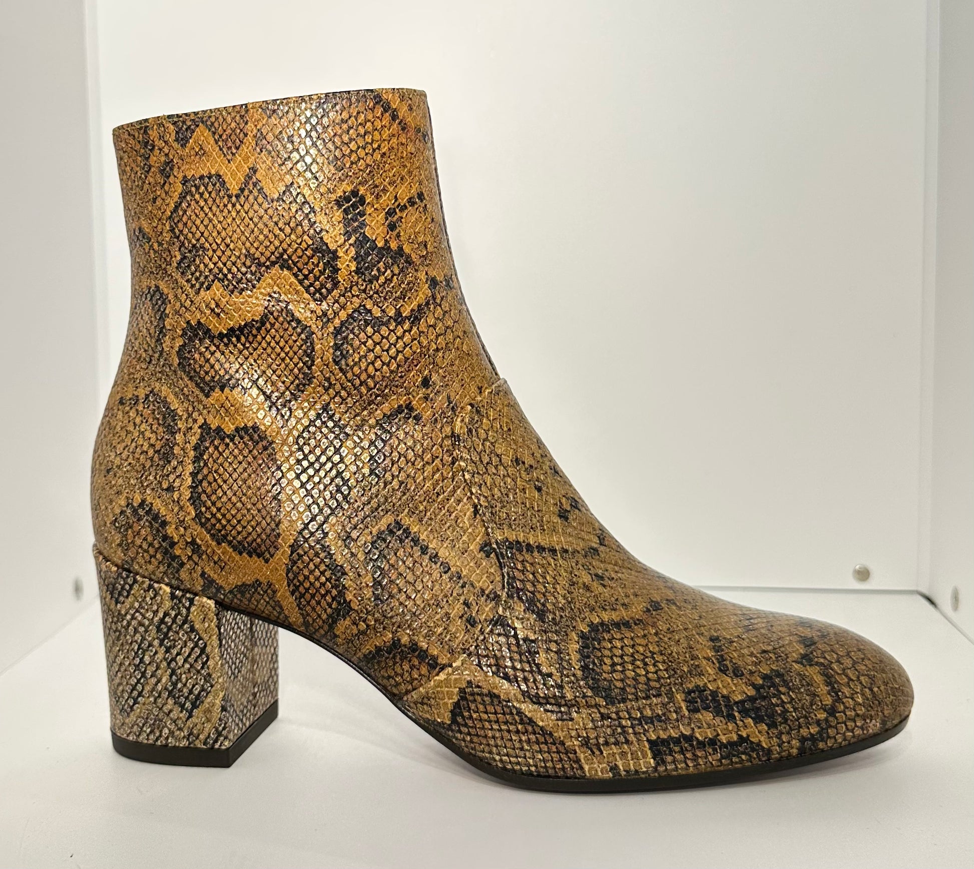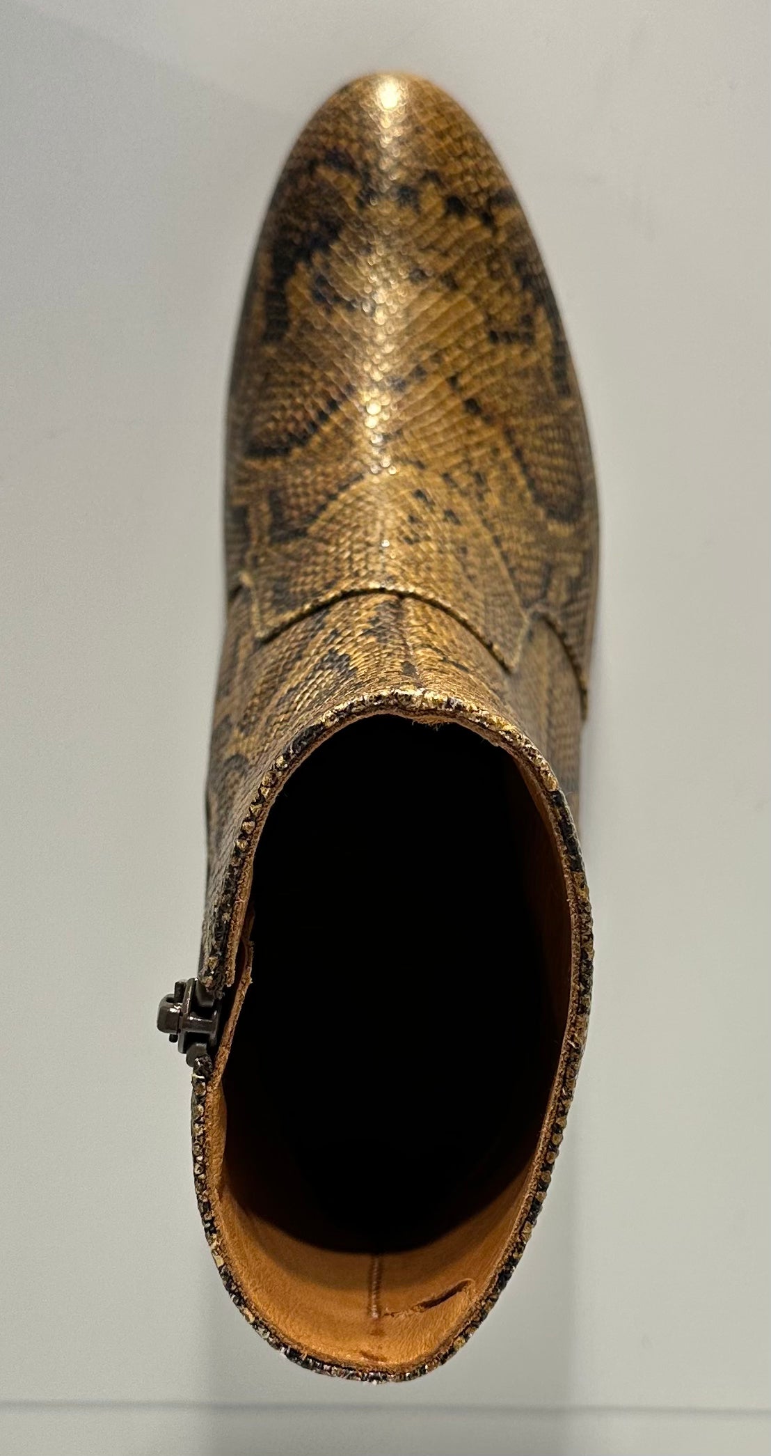 Texture Pitonata All-Over: La tomaia è realizzata in pregiata pelle con stampa pitone nei toni caldi dell'ocra, del terra e del nero, creando un pattern organico e sofisticato che cattura la luce ad ogni passo.