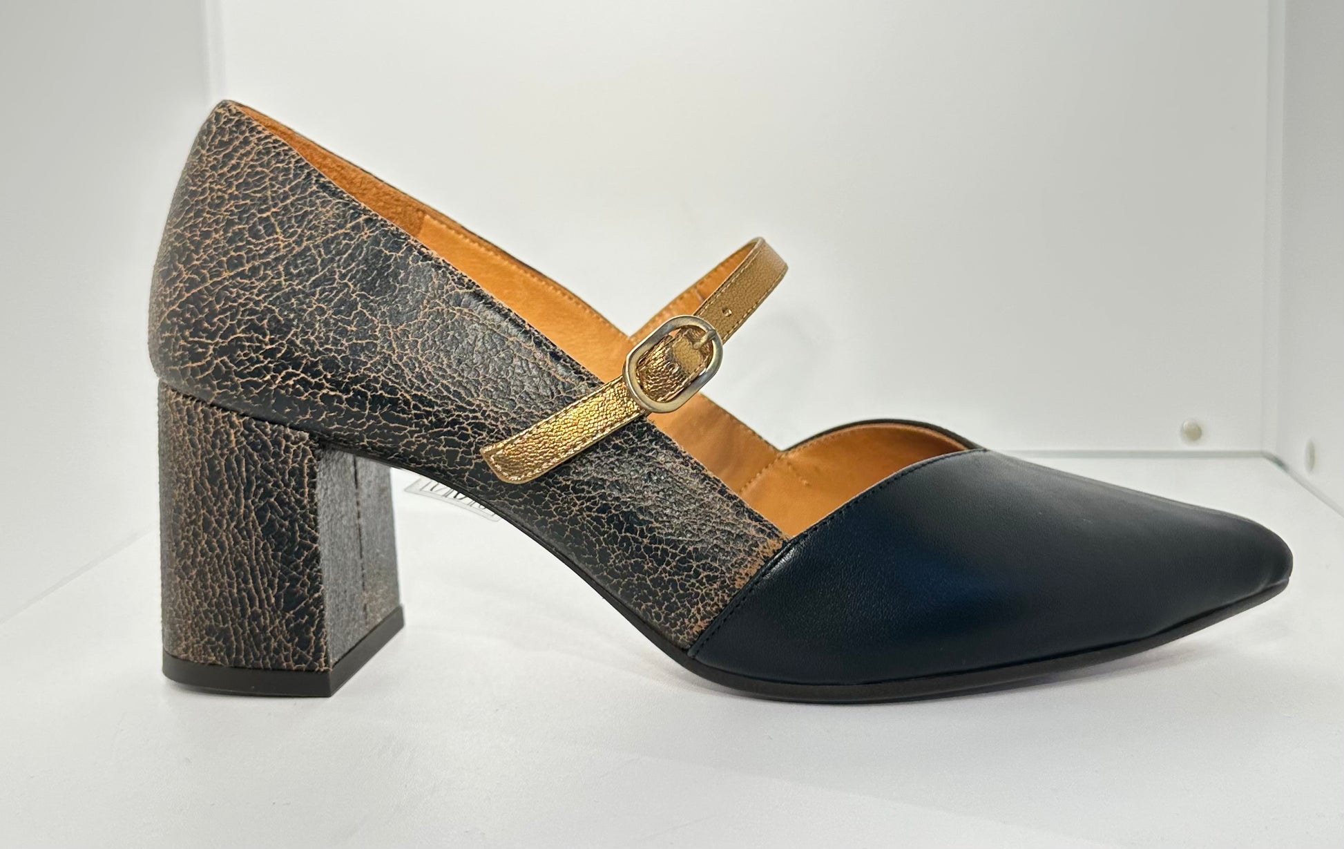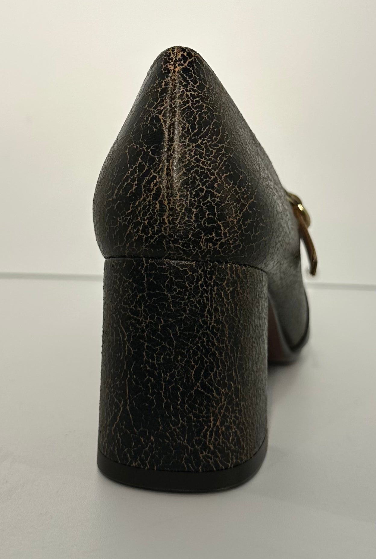 Contrasto Materico Bi-color: La scarpa presenta una parte anteriore in morbida pelle liscia nera, che si fonde armoniosamente con la parte posteriore e il tacco realizzati in una pelle lavorata con effetto "cracklé" bronzo/marrone, donando un fascino vissuto e lussuoso al tempo stesso.