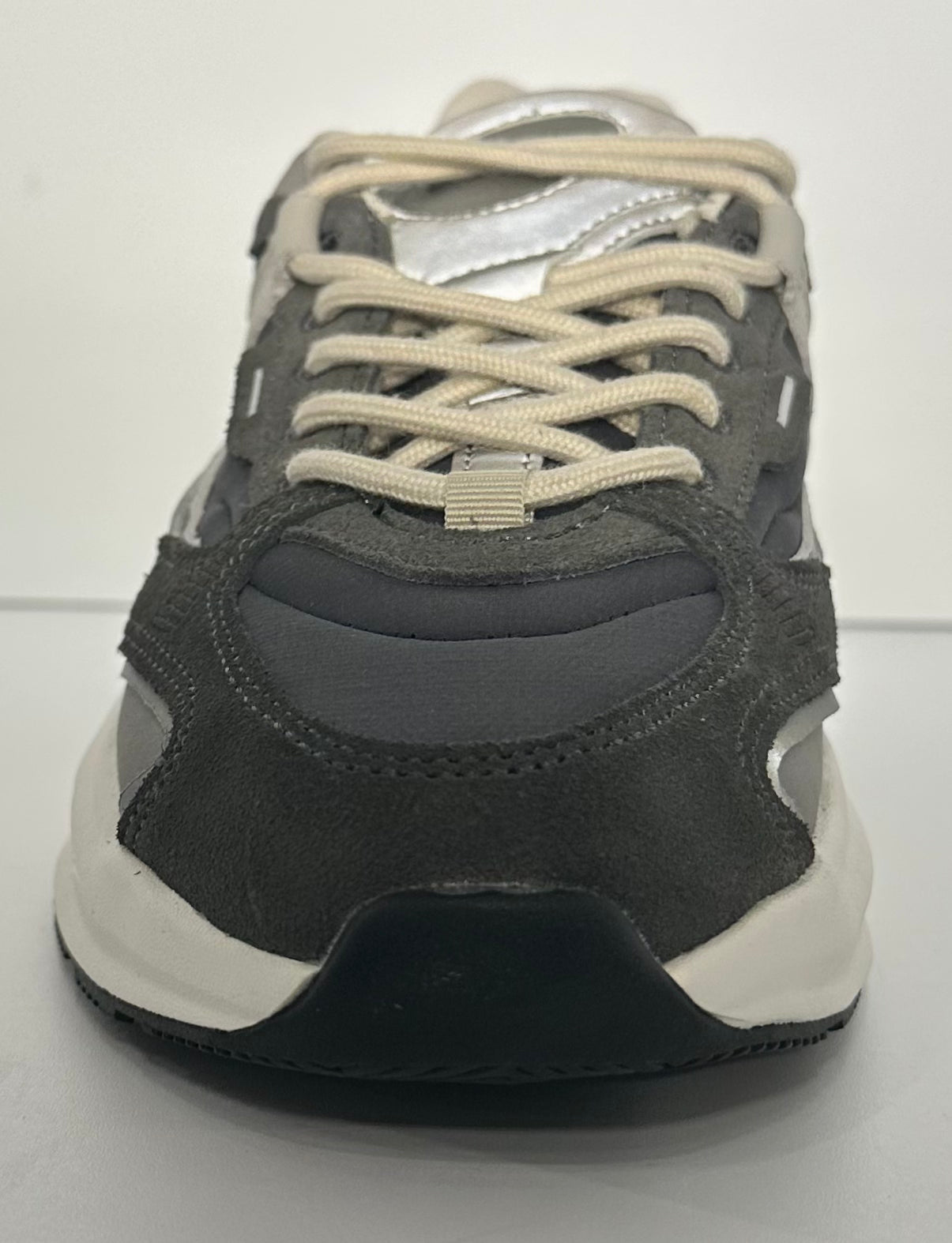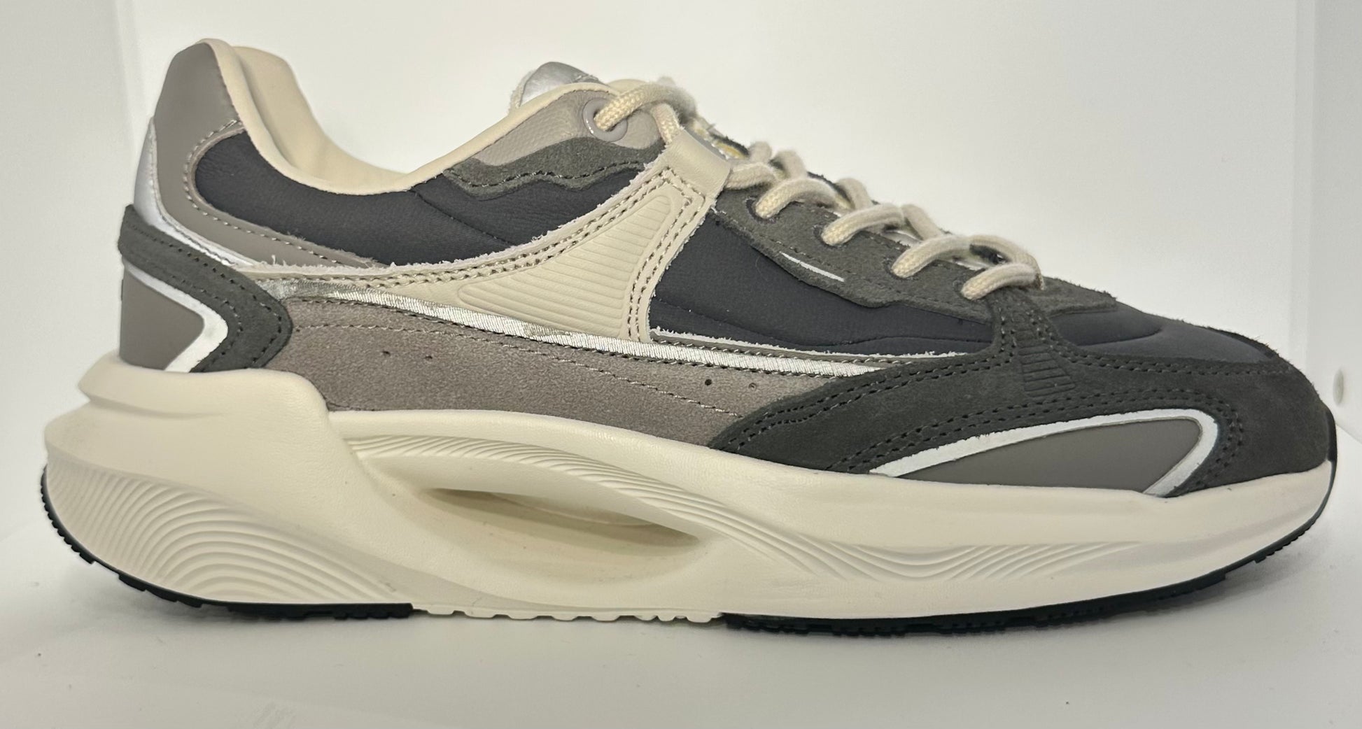 Palette Cromatica Neutra e Profonda: La tomaia gioca su tonalità di grigio scuro/antracite, grigio chiaro/tortora e **dettagli off-white/**crema. I tocchi di argento metallizzato aggiungono un flash di luce e un appeal futuristico.