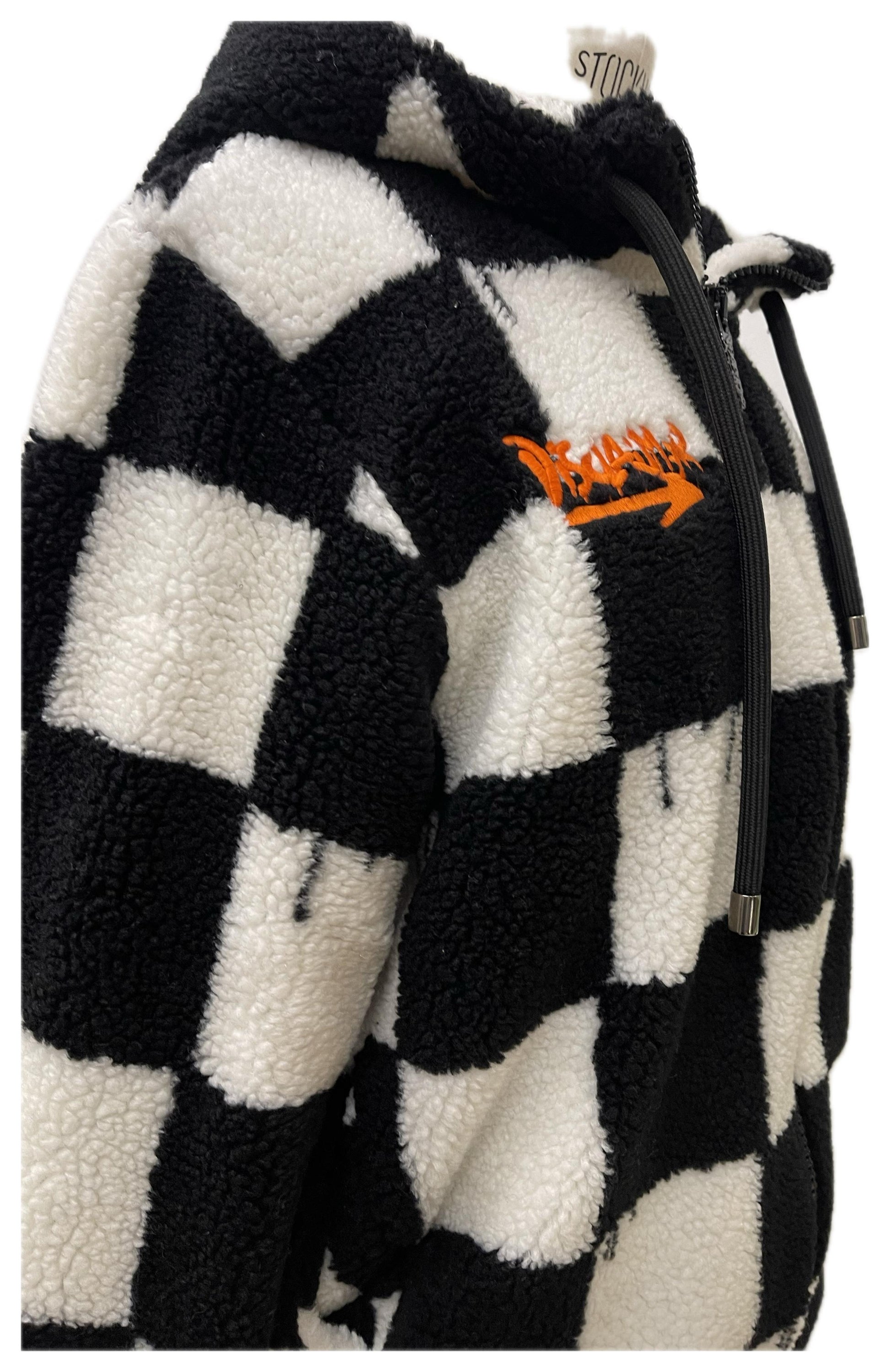 Giacca in eco-pelliccia effetto teddy con fantasia a scacchi bianco e nero e logo Disclaimer ricamato sul petto. Un mix di calore e streetstyle inconfondibile.