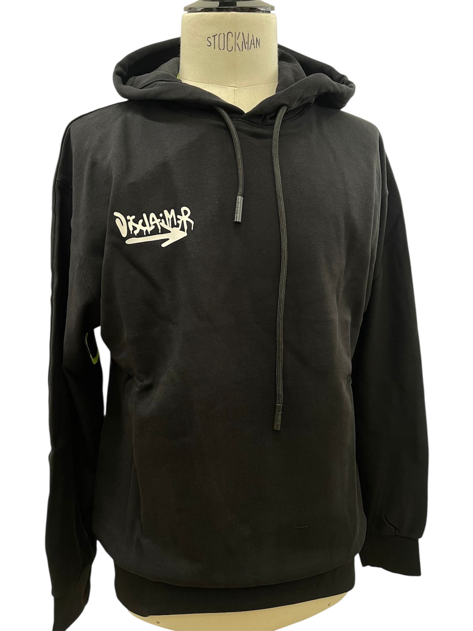 Felpa nera con cappuccio Disclaimer, dal design urban e dal forte impatto visivo. Sul fronte è presente la scritta Disclaimer in bianco effetto graffiti, mentre sul retro e lungo le maniche spicca la maxi stampa gialla fluo con effetto colatura.