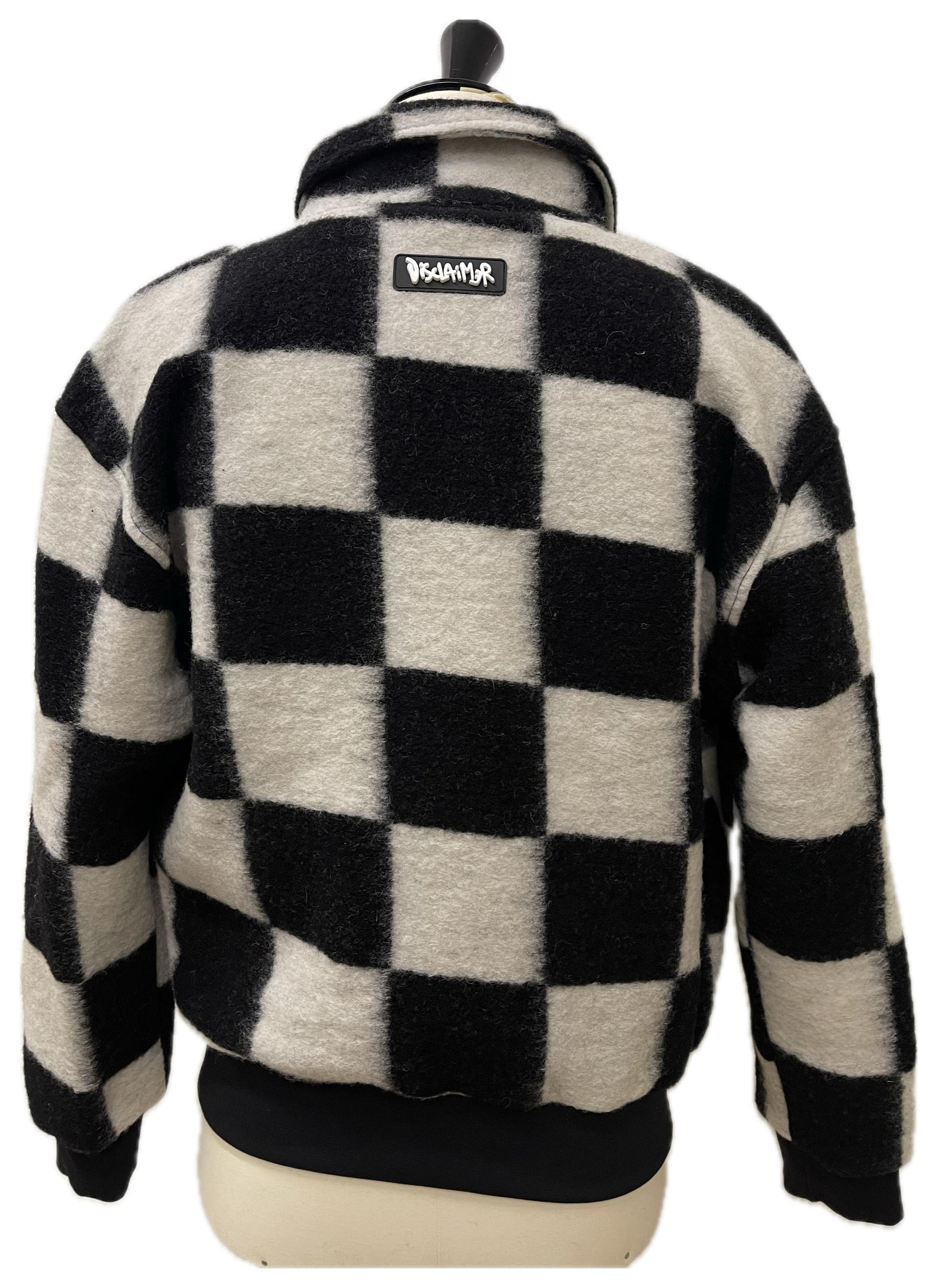 Giacca in morbido tessuto effetto pelliccia con iconica fantasia a scacchi bianco e nero. Un capo statement che unisce comfort e streetstyle in perfetto stile Disclaimer.