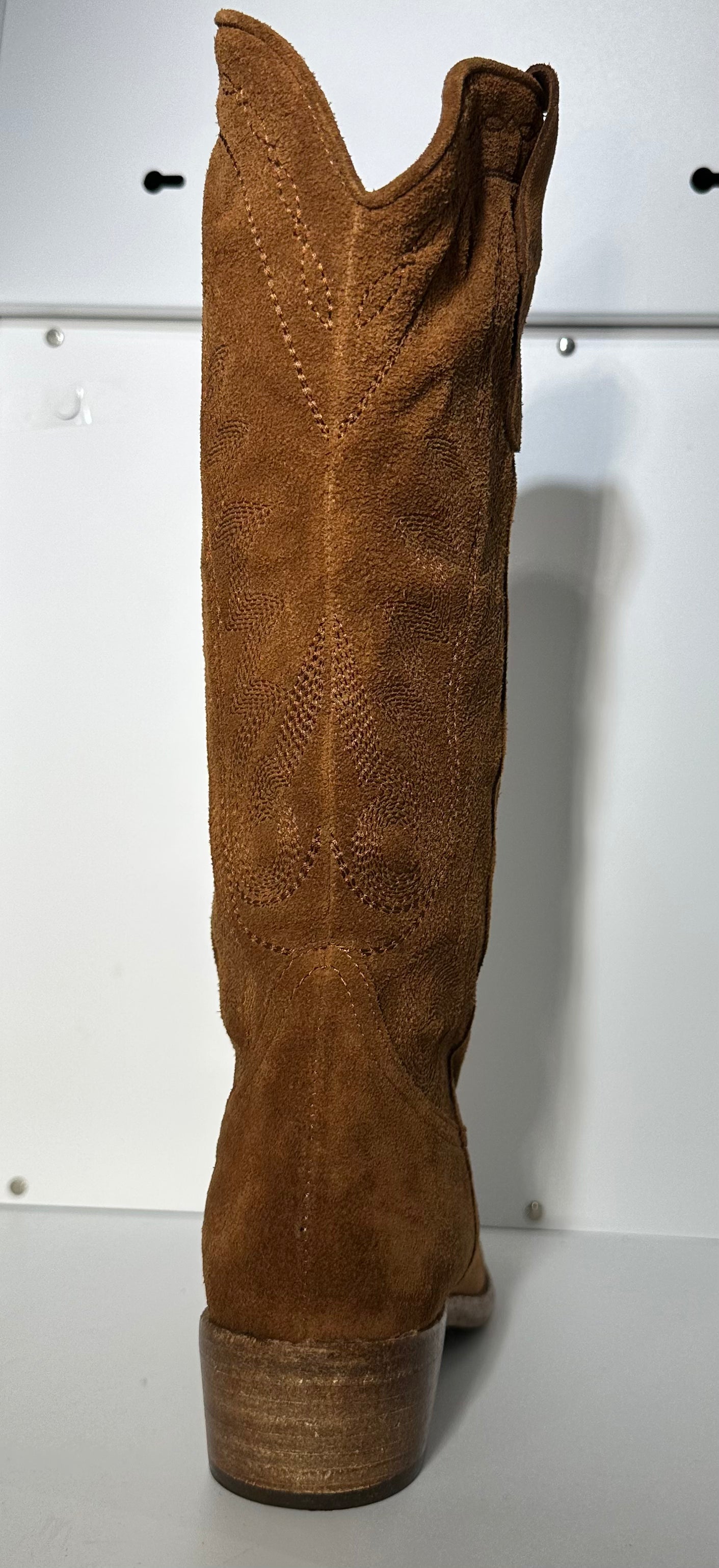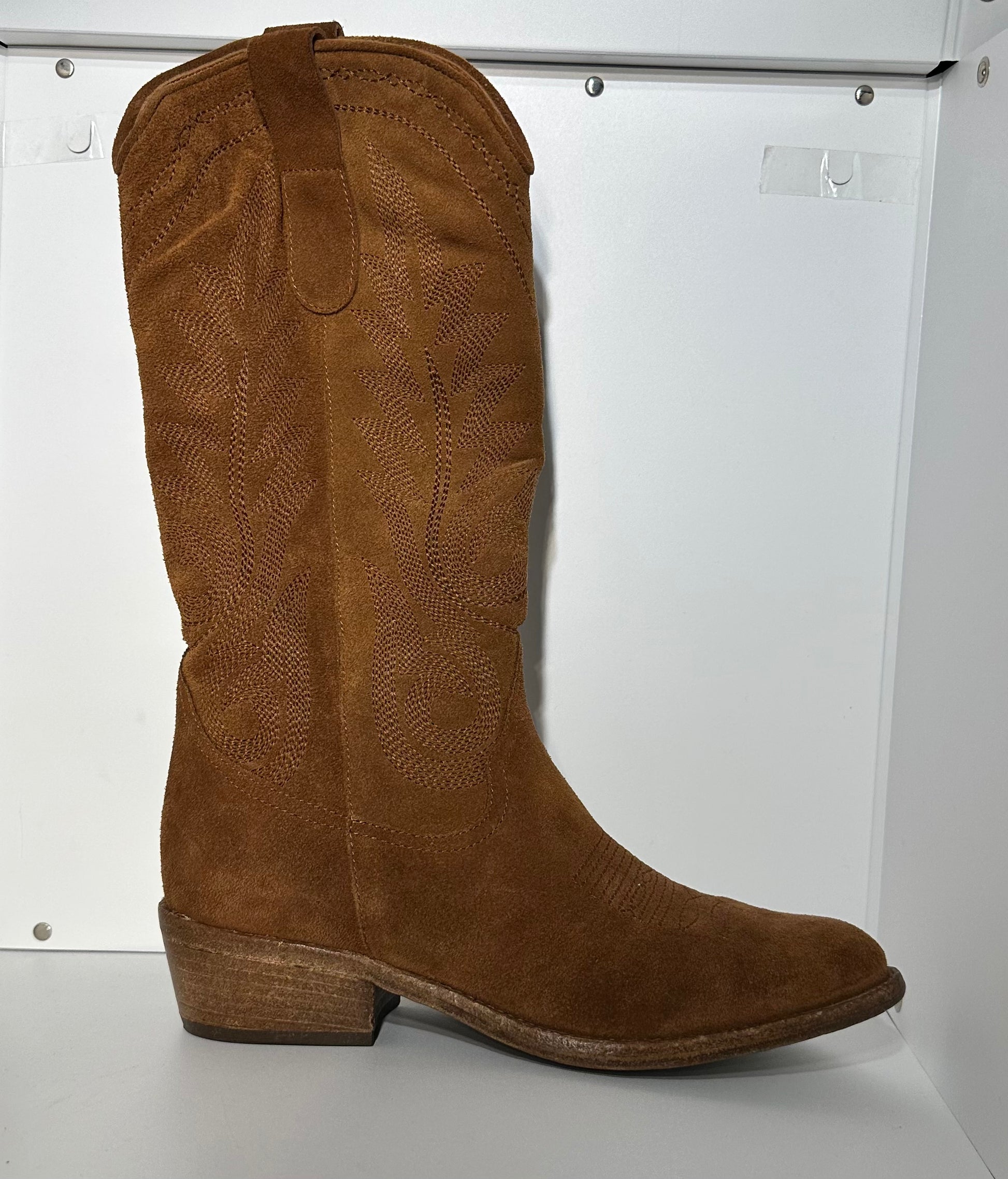Ricami Western Tradizionali: Il gambale è impreziosito da impunture tono su tono che disegnano motivi ornamentali classici dello stile camperos, aggiungendo profondità e artigianalità al design.