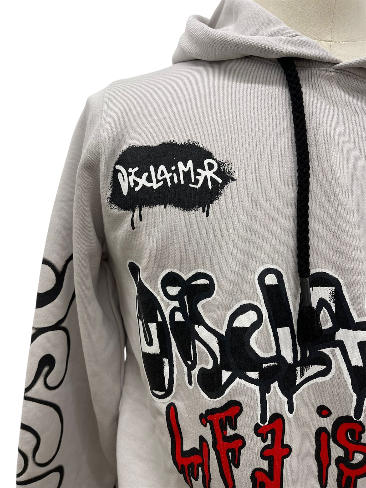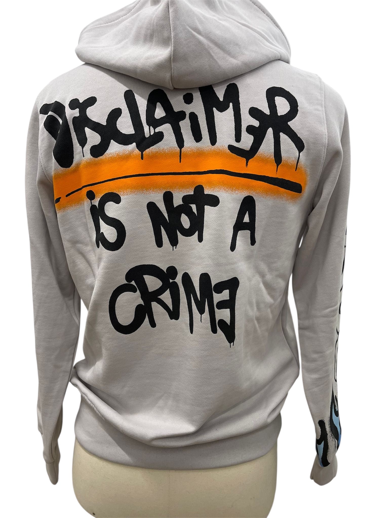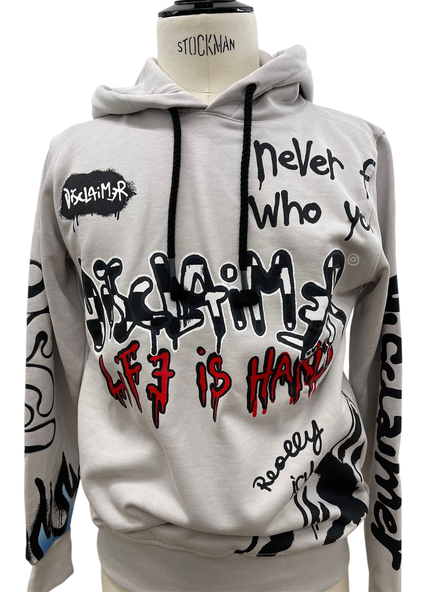 Felpa con cappuccio firmata Disclaimer, dal carattere urbano e deciso. Il design richiama lo stile graffiti street art, con scritte a effetto spray che trasmettono un messaggio diretto e ribelle. Sul fronte campeggiano le frasi “Life is Hard” e “Never Forget Who You Are”, mentre il retro riporta la scritta “Disclaimer is not a crime” con un tratto arancione che evidenzia il messaggio.