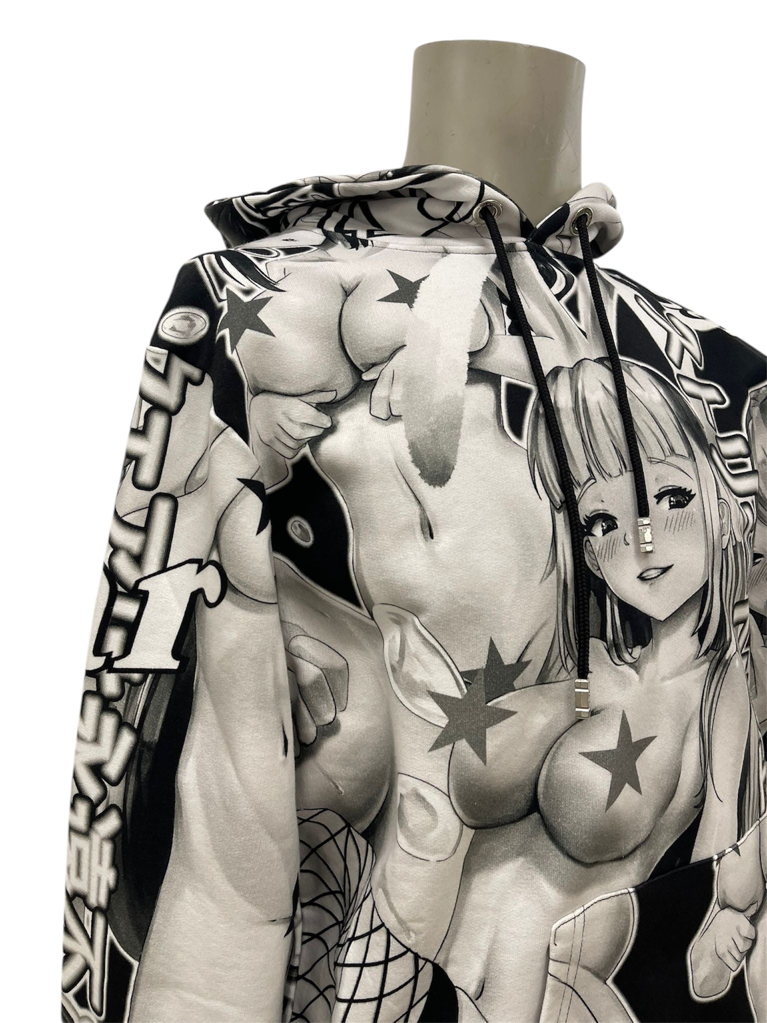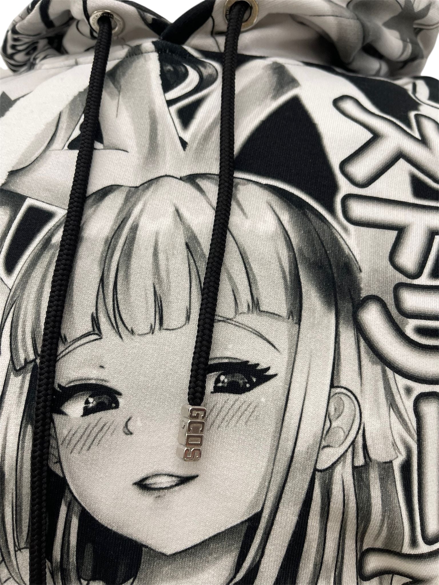 Felpa con cappuccio firmata GCCS Milano, caratterizzata da un motivo all-over ispirato al mondo manga. Questa felpa si distingue per il design in bianco e nero con dettagli grafici ad alta definizione e scritte in stile giapponese. È dotata di coulisse con terminali metallici personalizzati GCCS e ampia tasca frontale a marsupio.