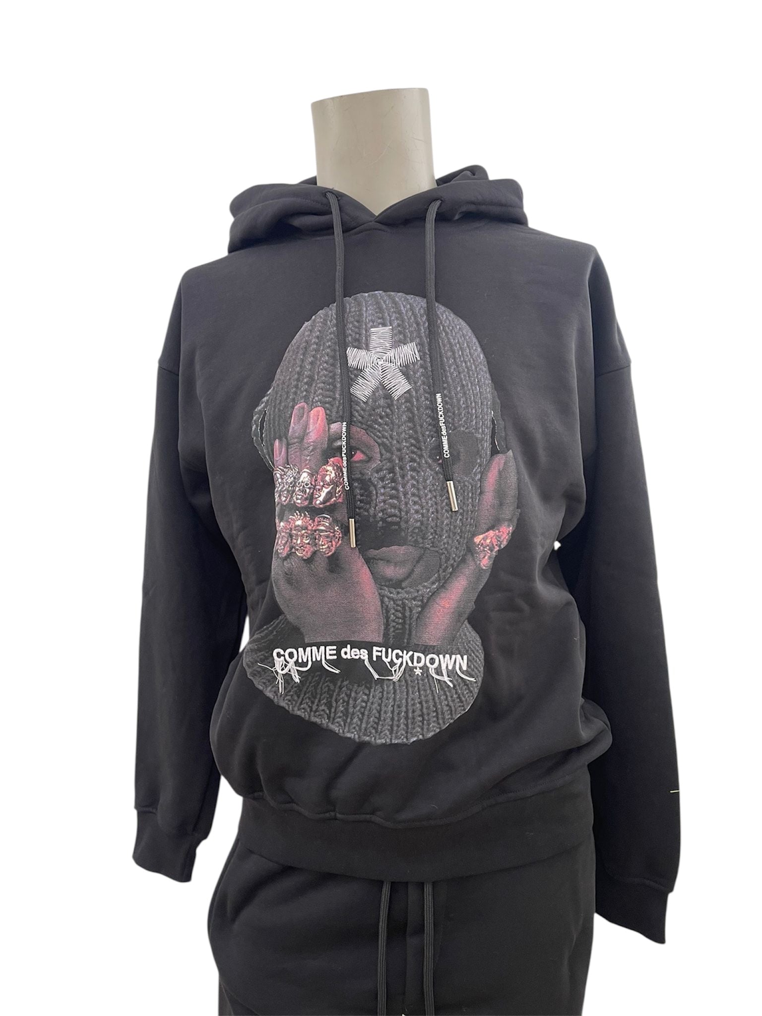 Un capo che unisce streetwear audace e comfort quotidiano. Questa felpa nera con cappuccio è caratterizzata da una grafica di grande impatto arricchito da dettagli sulle mani e anelli in evidenza. Il logo COMME des FUCKDOWN è stampato in bianco sul davanti, mentre il retro resta minimal in tinta unita.