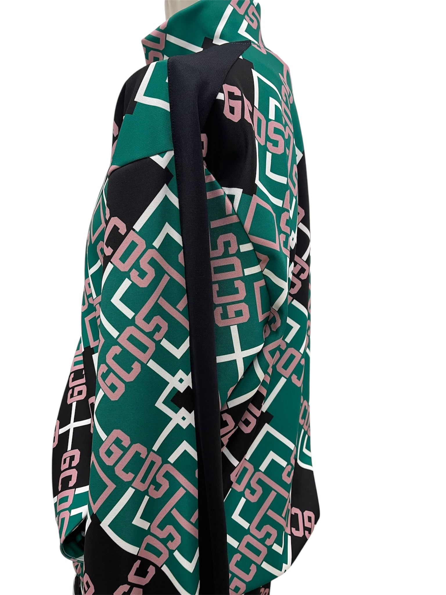 Una felpa sportiva dallo stile deciso e contemporaneo, firmata GCDS. Il design è caratterizzato da un pattern geometrico all-over nei toni del verde, nero e rosa, con logo ripetuto che rende il capo immediatamente riconoscibile. La zip frontale con tirazip logato e il collo alto aggiungono un tocco di carattere streetwear.