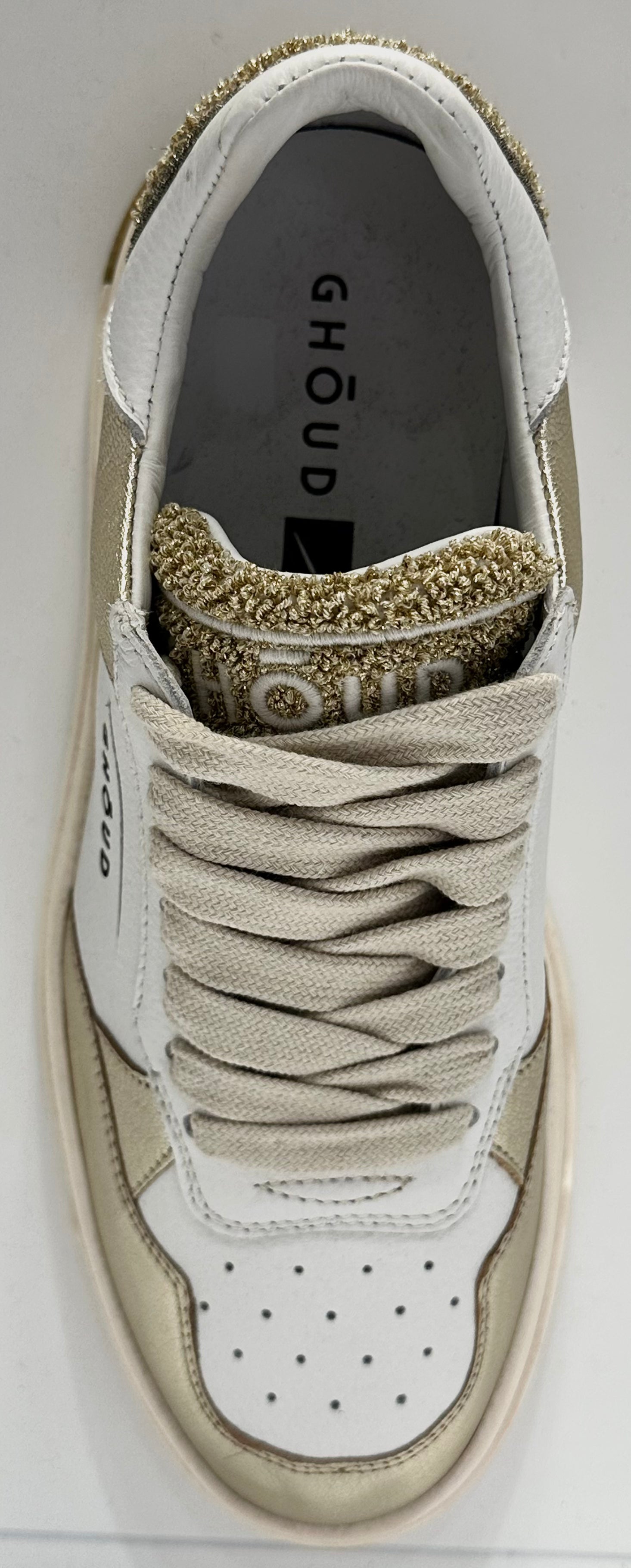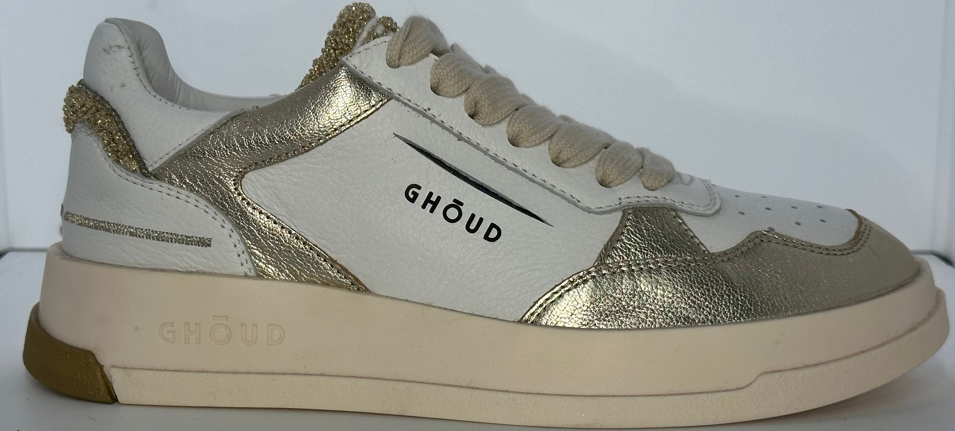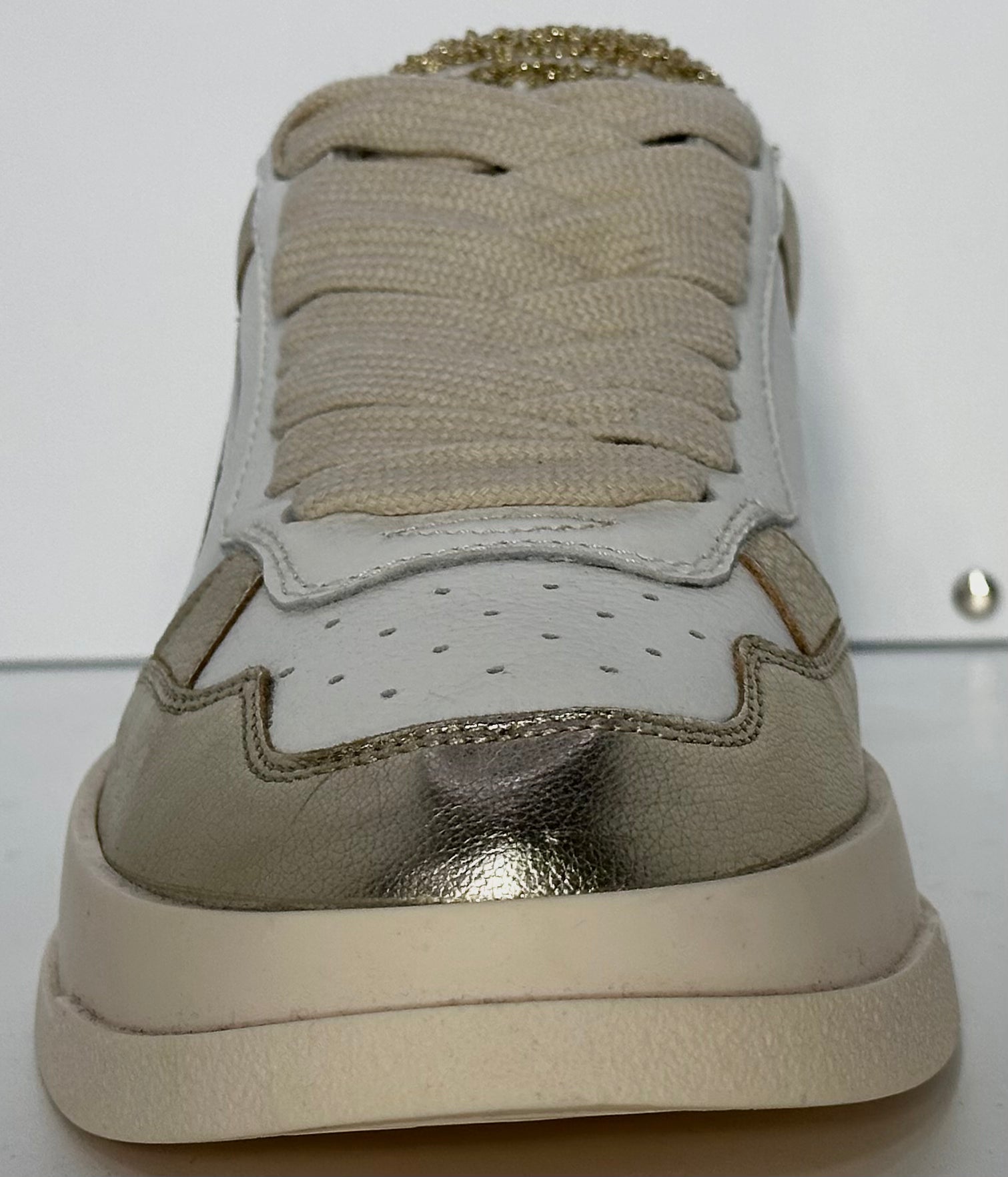 Realizzata in pelle bianca di alta qualità, è impreziosita da inserti metallizzati color oro che donano carattere e raffinatezza al design. I dettagli scintillanti sul tallone e sulla linguetta aggiungono un accento glamour, mantenendo comunque lo stile minimal e sofisticato tipico del brand veneziano.