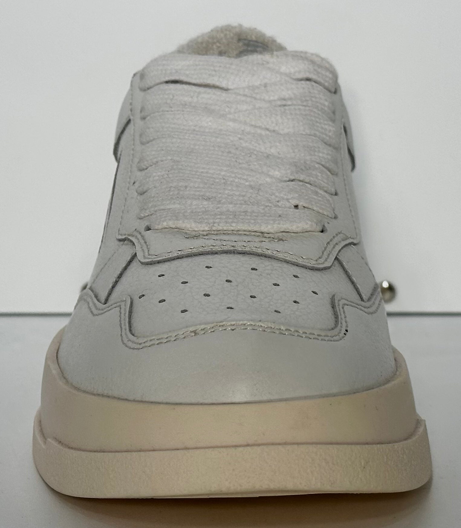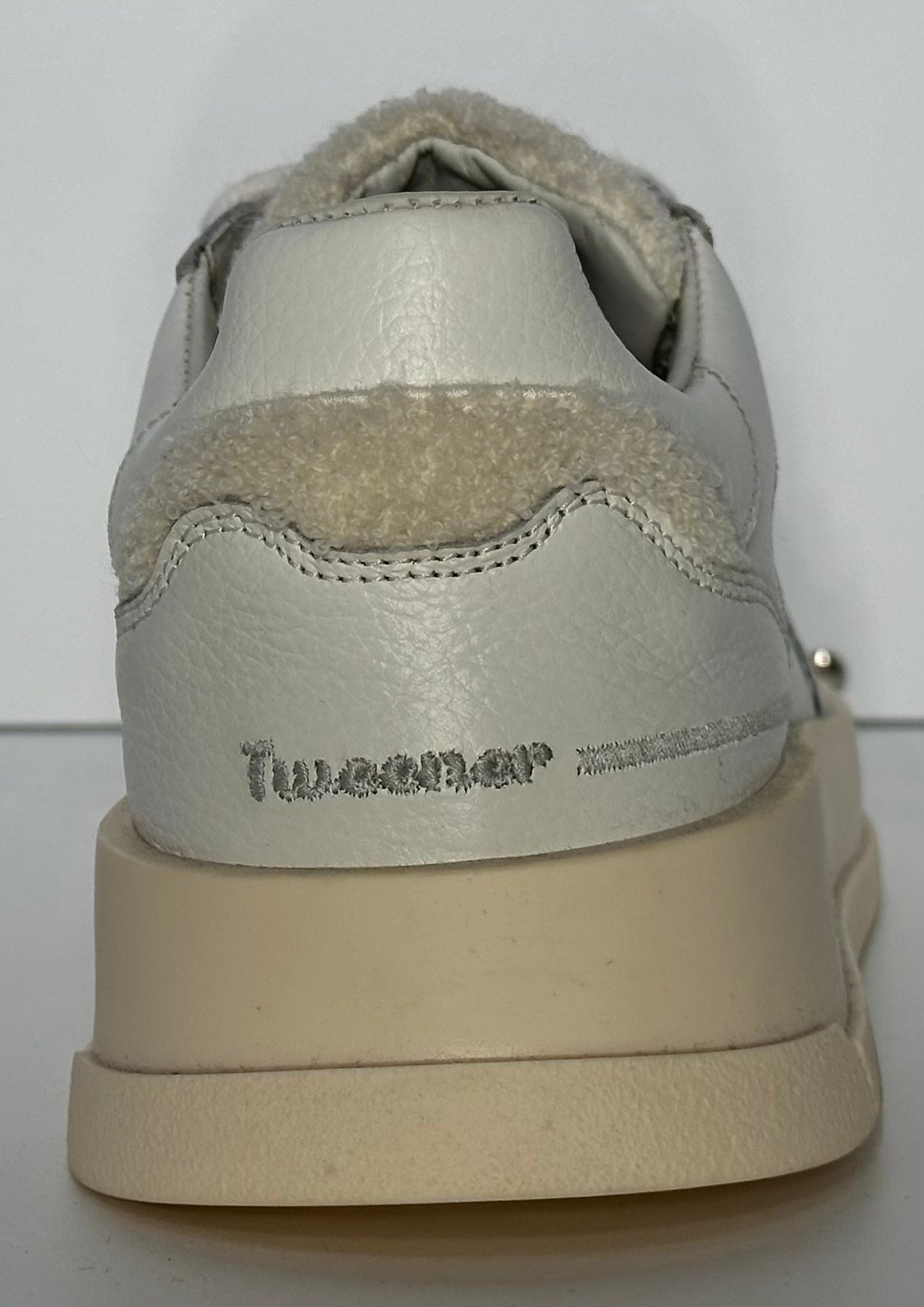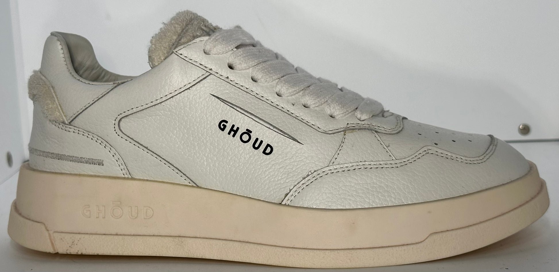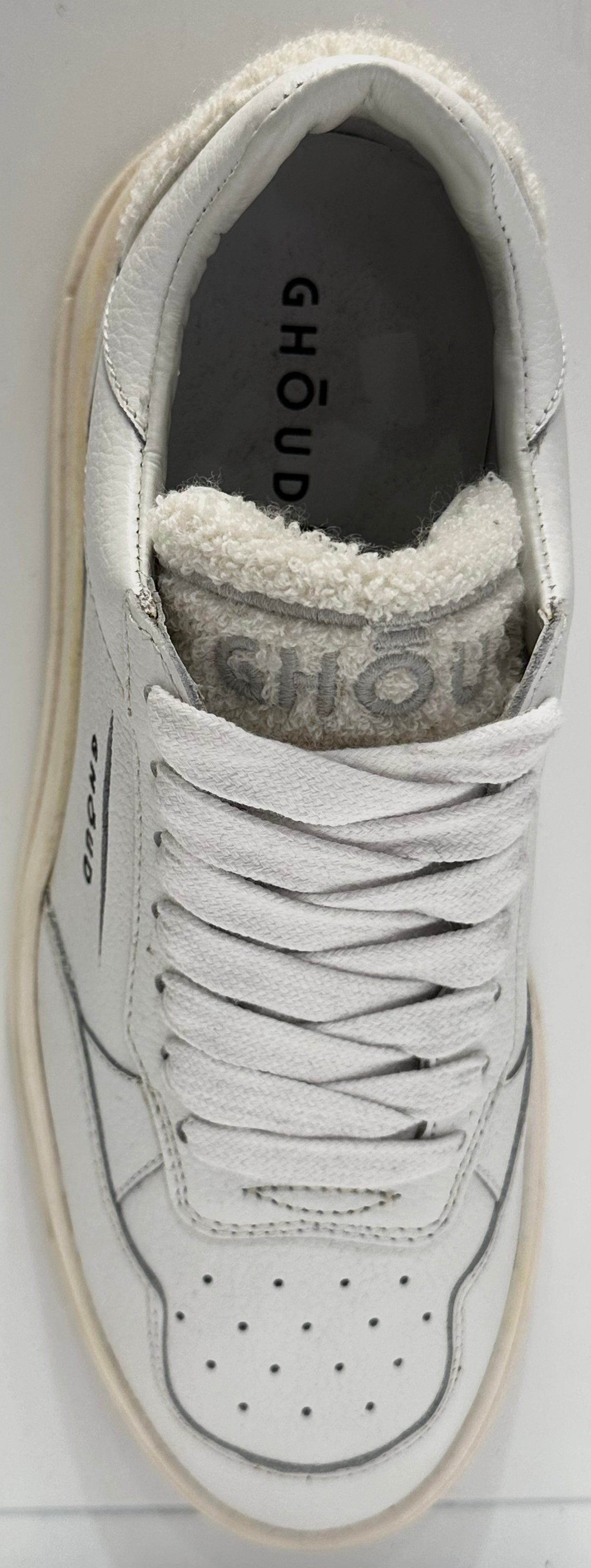 Realizzata in morbida pelle bianca martellata, offre un look elegante e versatile, perfetto per ogni occasione. I dettagli tono su tono e il logo GHŌUD laterale conferiscono un tocco di sobria esclusività, mentre la linguetta e il tallone in morbido shearling aggiungono comfort e carattere.