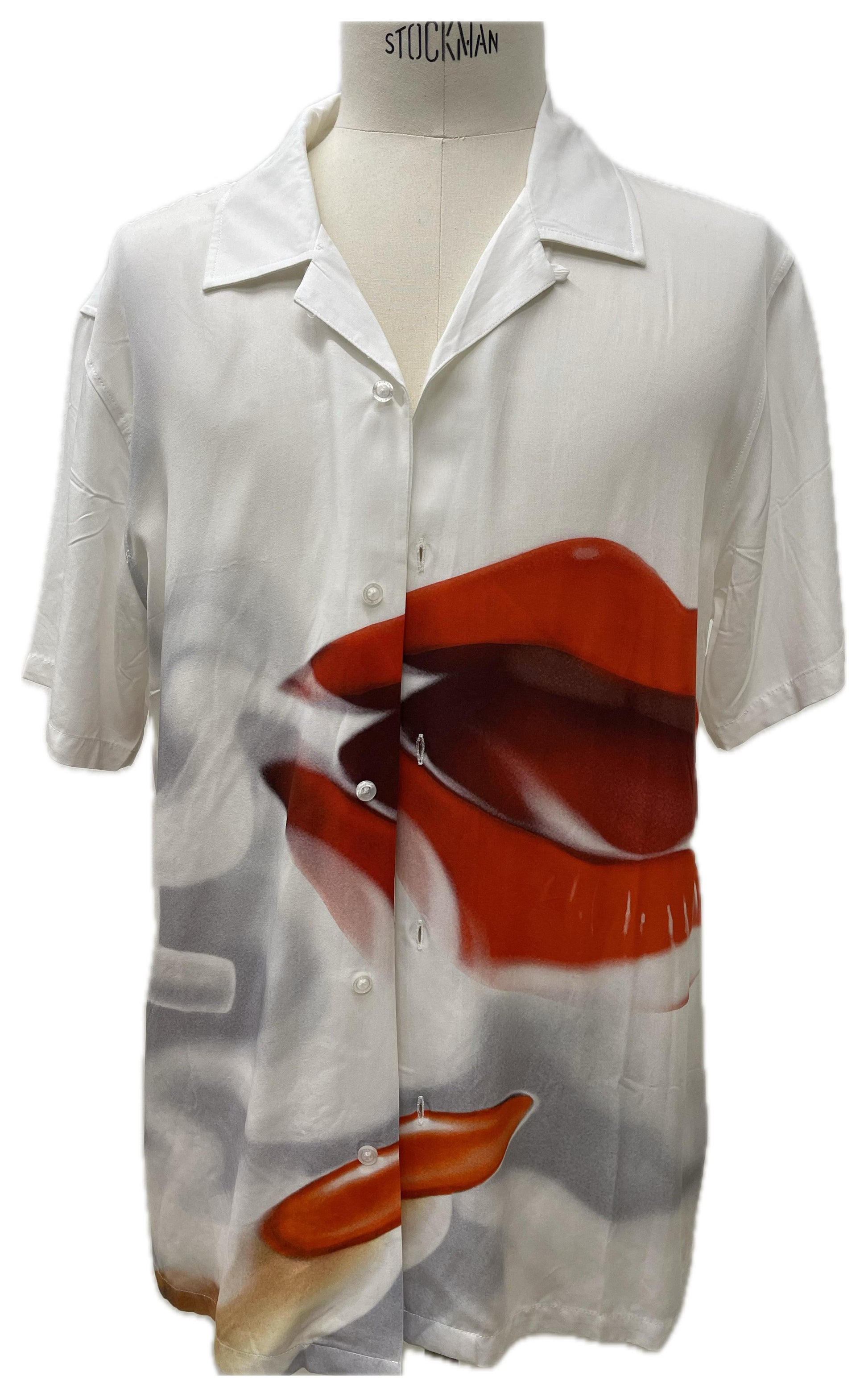 Camicia a maniche corte bianca con colletto cubano e maxi stampa frontale “lips” in rosso/arancio. Tessuto fluido e taglio rilassato per un look estivo bold, tra skate e arte pop.