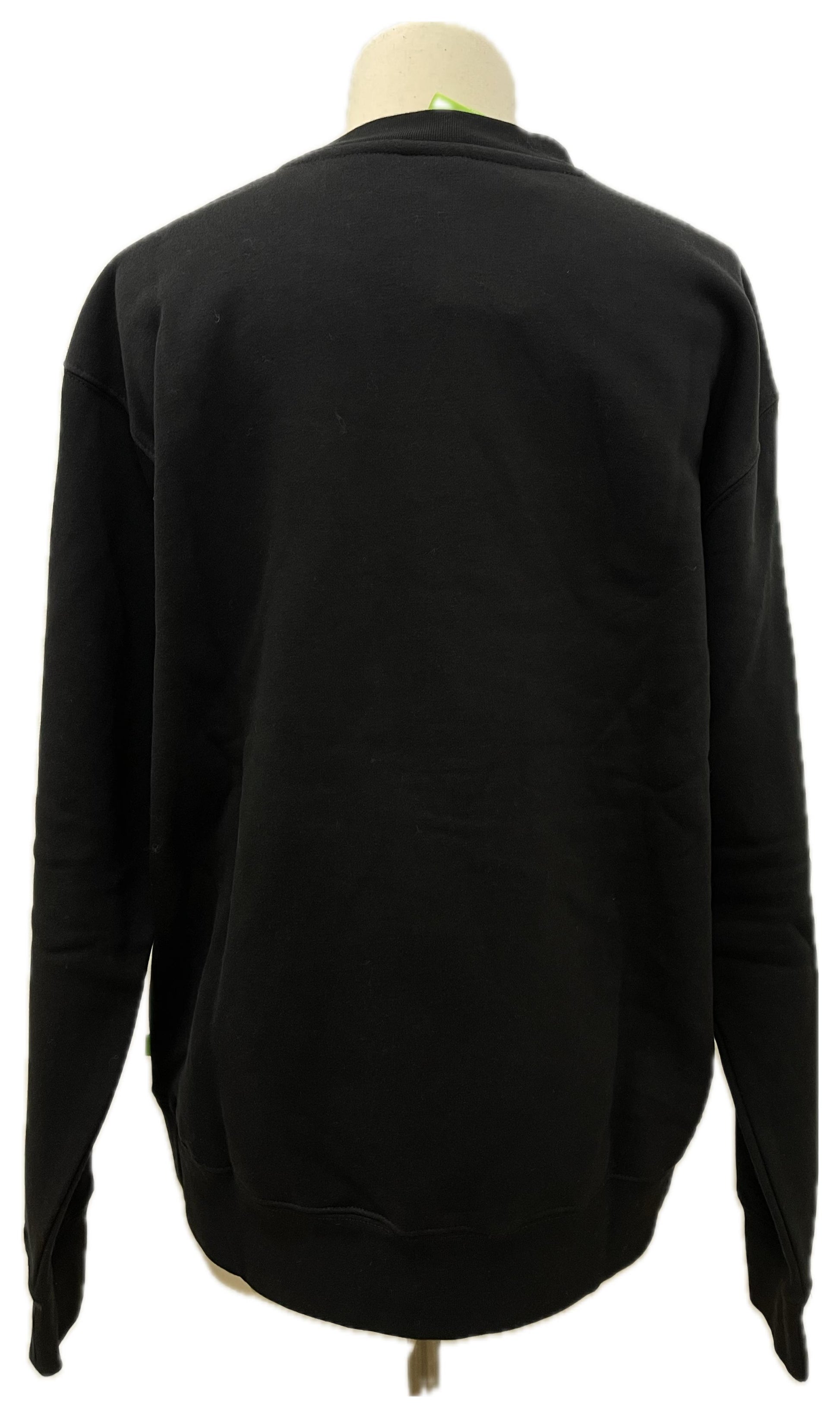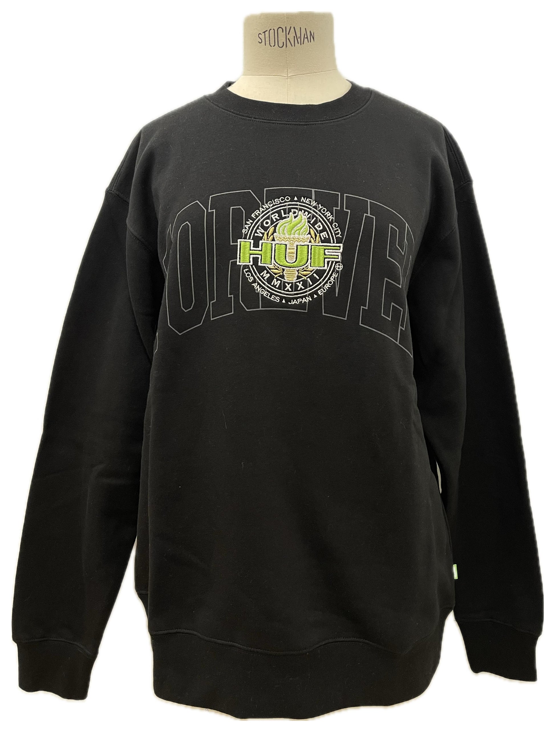 Felpa girocollo nera con maxi ricamo HUF centrale: patch rotonda stile globo in verde fluo, retro pulito. Look deciso ma facile da abbinare.