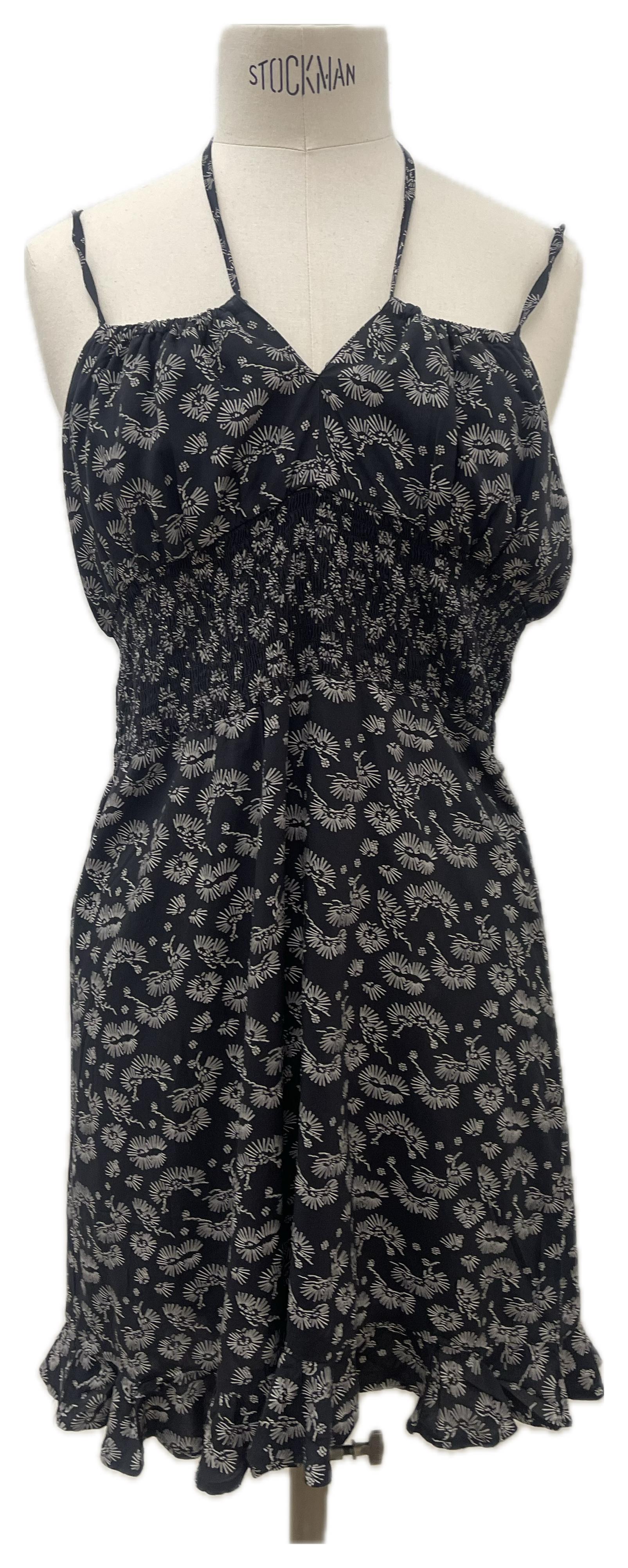Abito corto nero con micro-stampa all-over, spalline sottili e corpino arricciato che segue la linea del corpo. Gonna svasata e orlo mosso: perfetto per il giorno e la sera con un cambio scarpe.