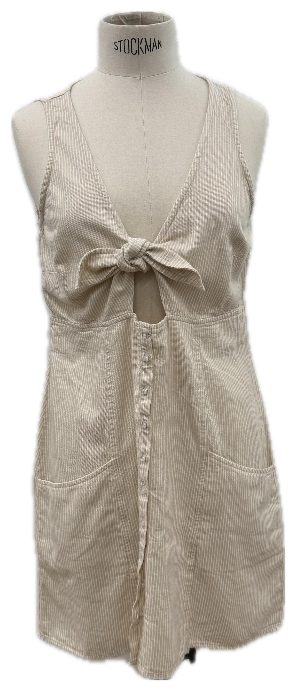 Abito smanicato in maglia a costine color panna con scollo a V e fiocco frontale. Linea dritta e morbida, tasche applicate e vibe casual/romantico: si porta da solo nelle mezze stagioni o stratificato su T-shirt/dolcevita quando fa più freddo.