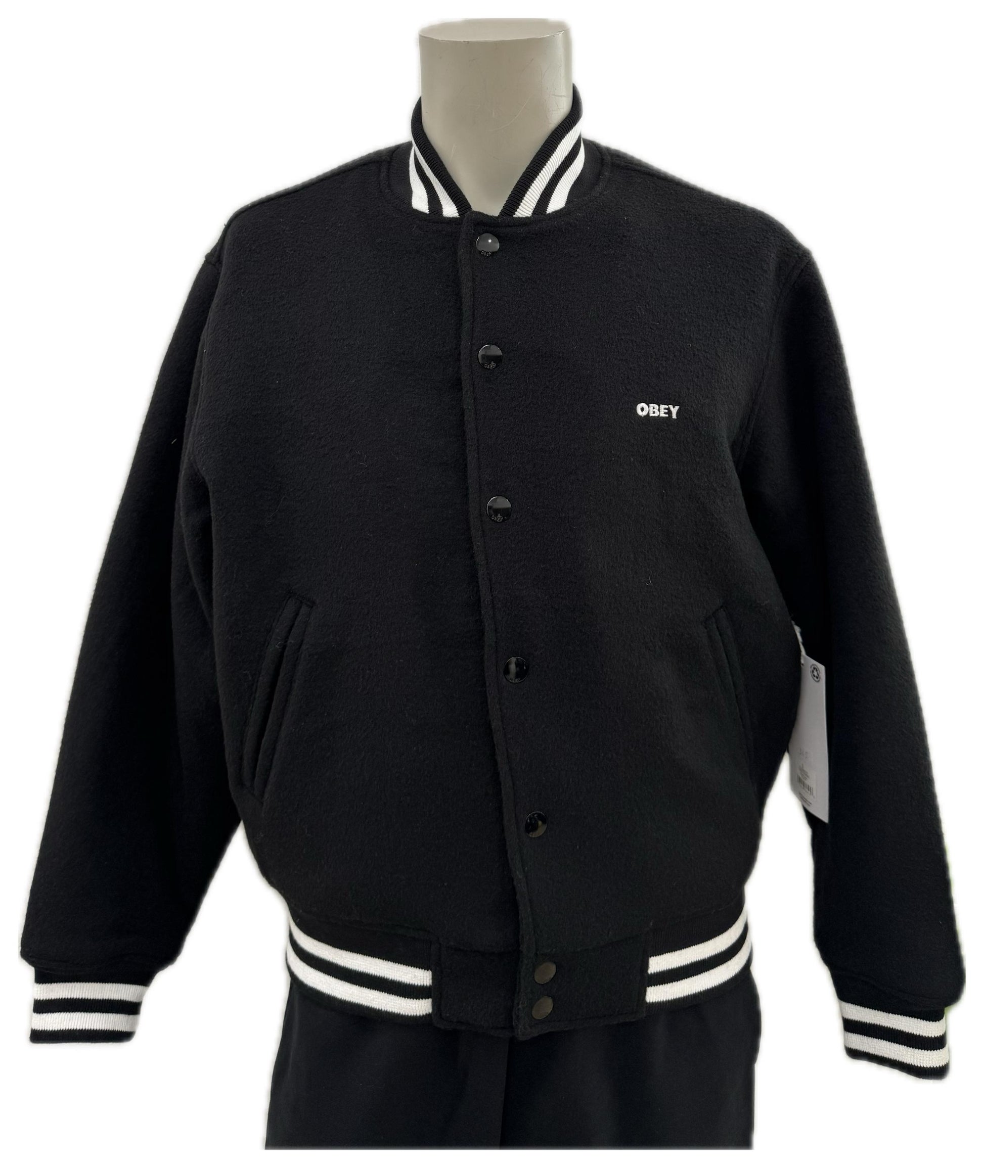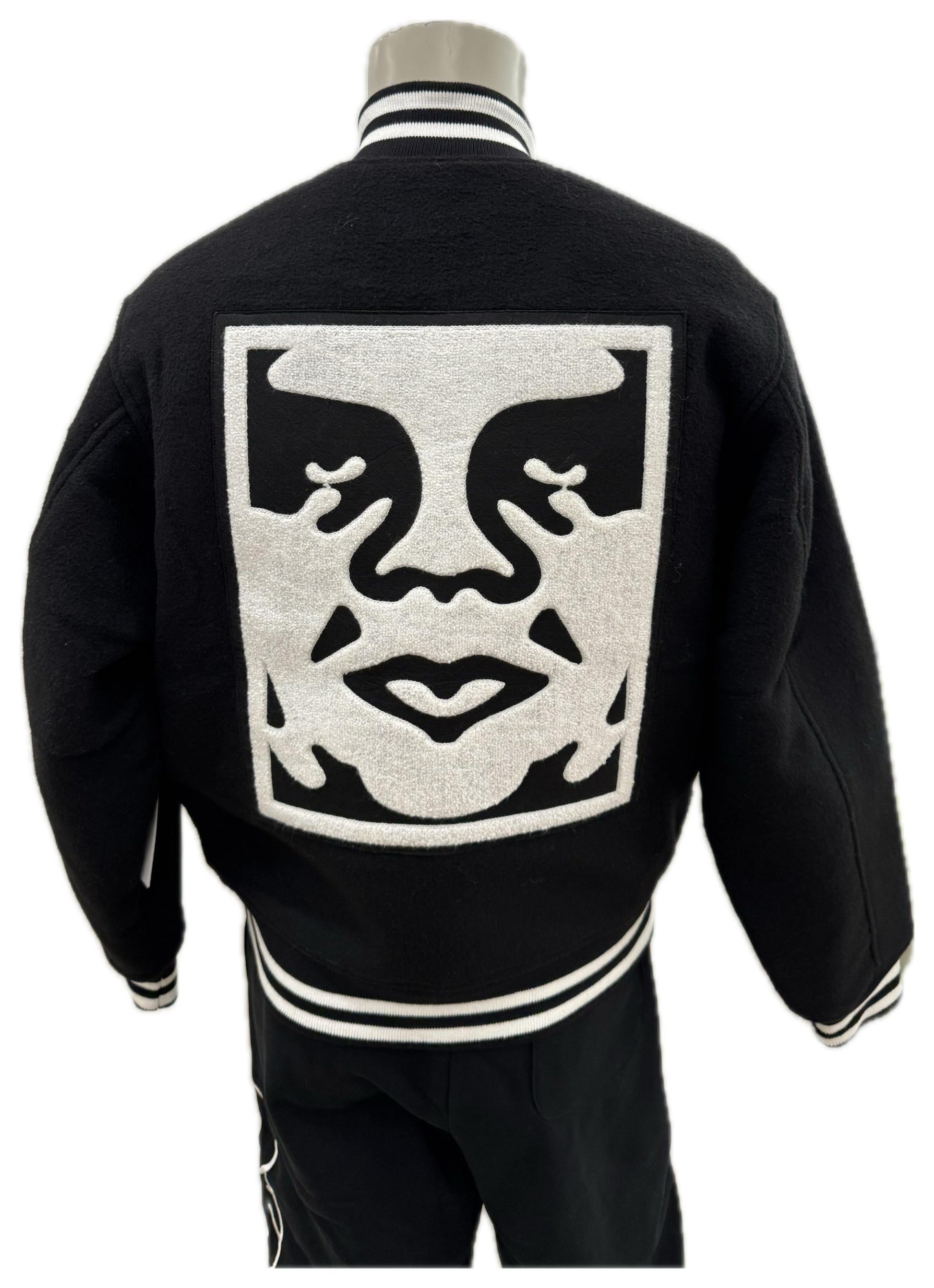 Giacca varsity nera con dettagli a righe e maxi grafica Obey Giant sul retro. Pulita davanti, scenografica dietro: perfetta per look street e casual.