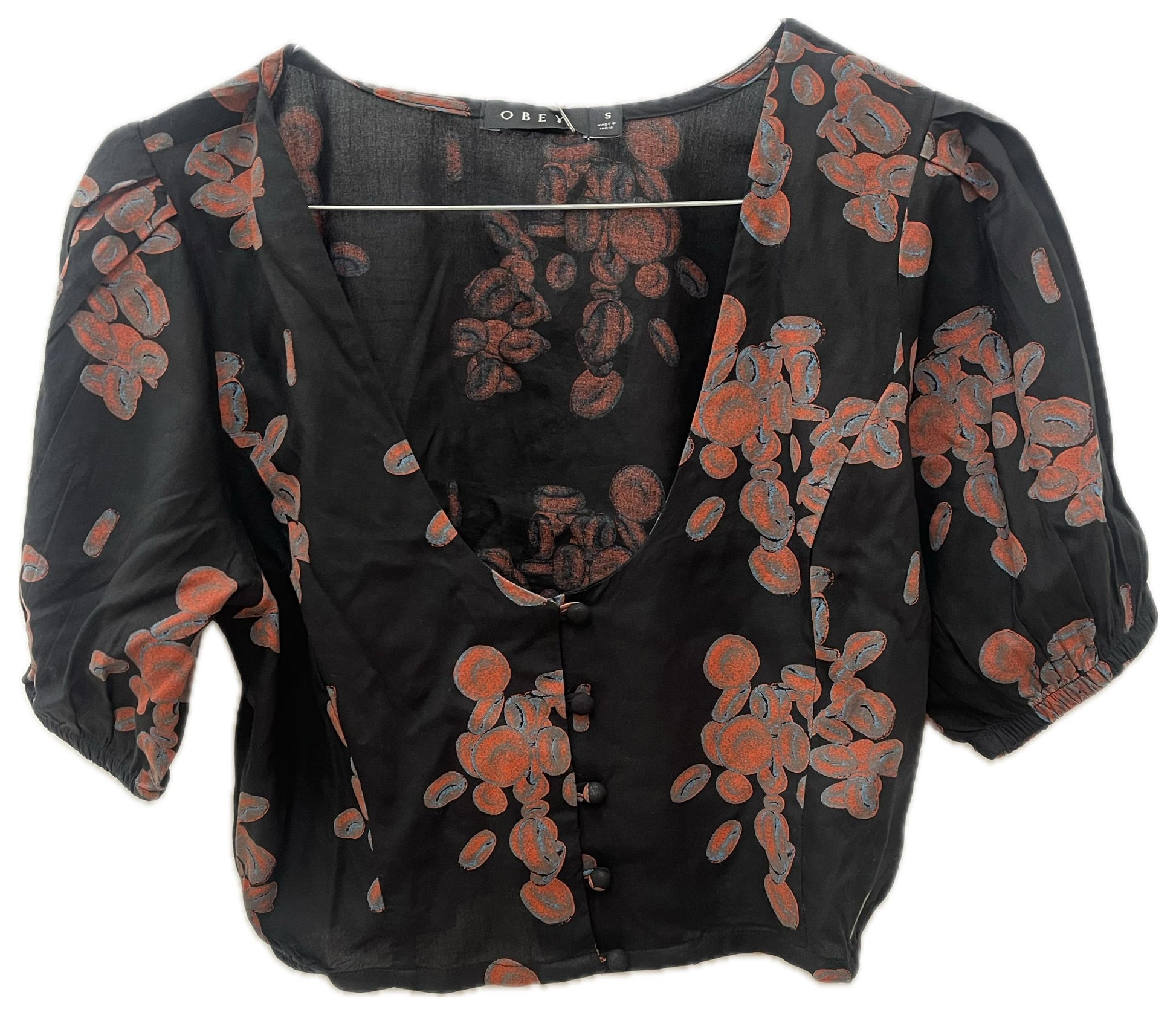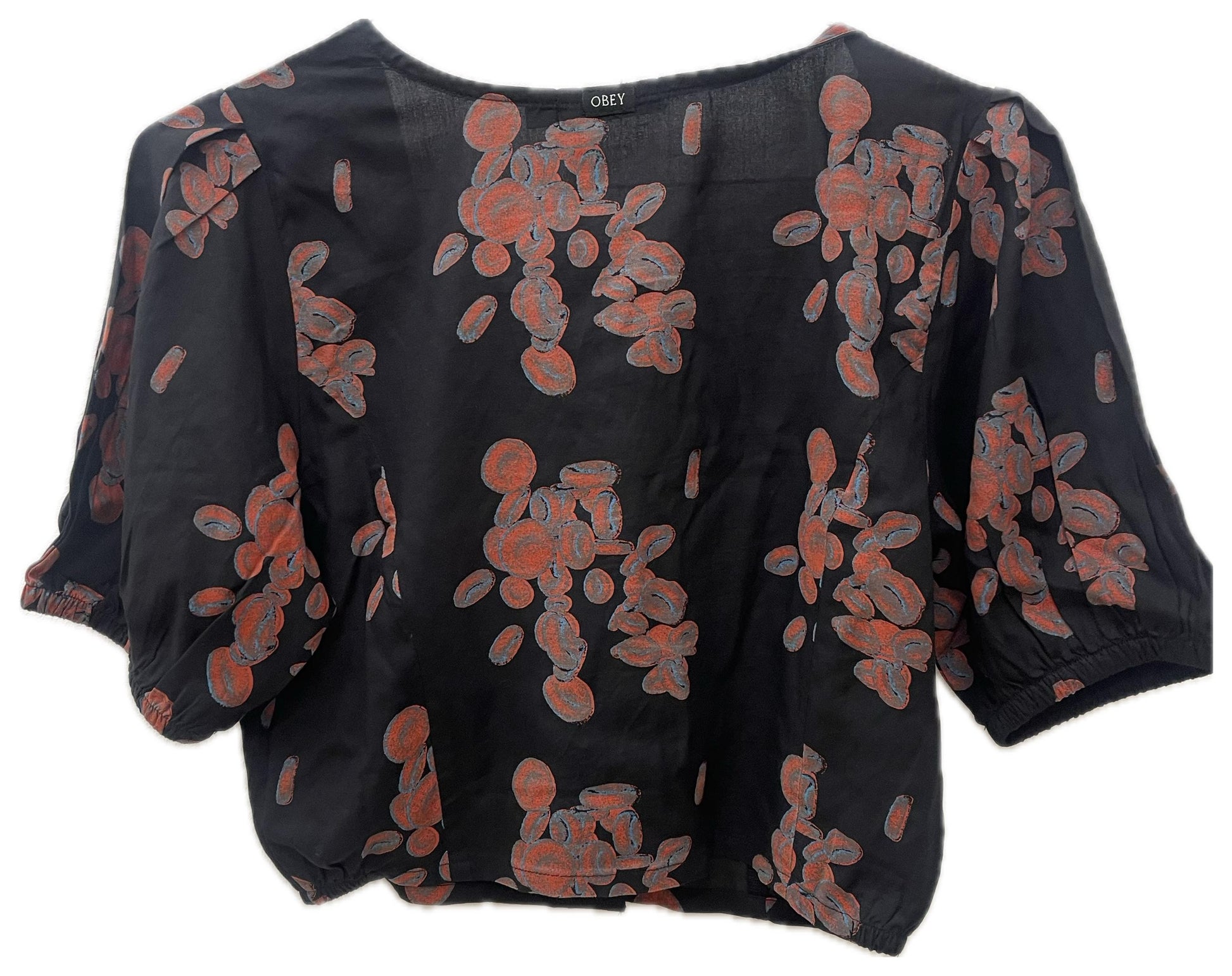 Top leggero nero con stampa floreale rosa/salmone, scollo a V e maniche corte morbide. Taglio cropped con fondo leggermente arricciato: perfetto con vita alta per un look estivo/casual-chic.
