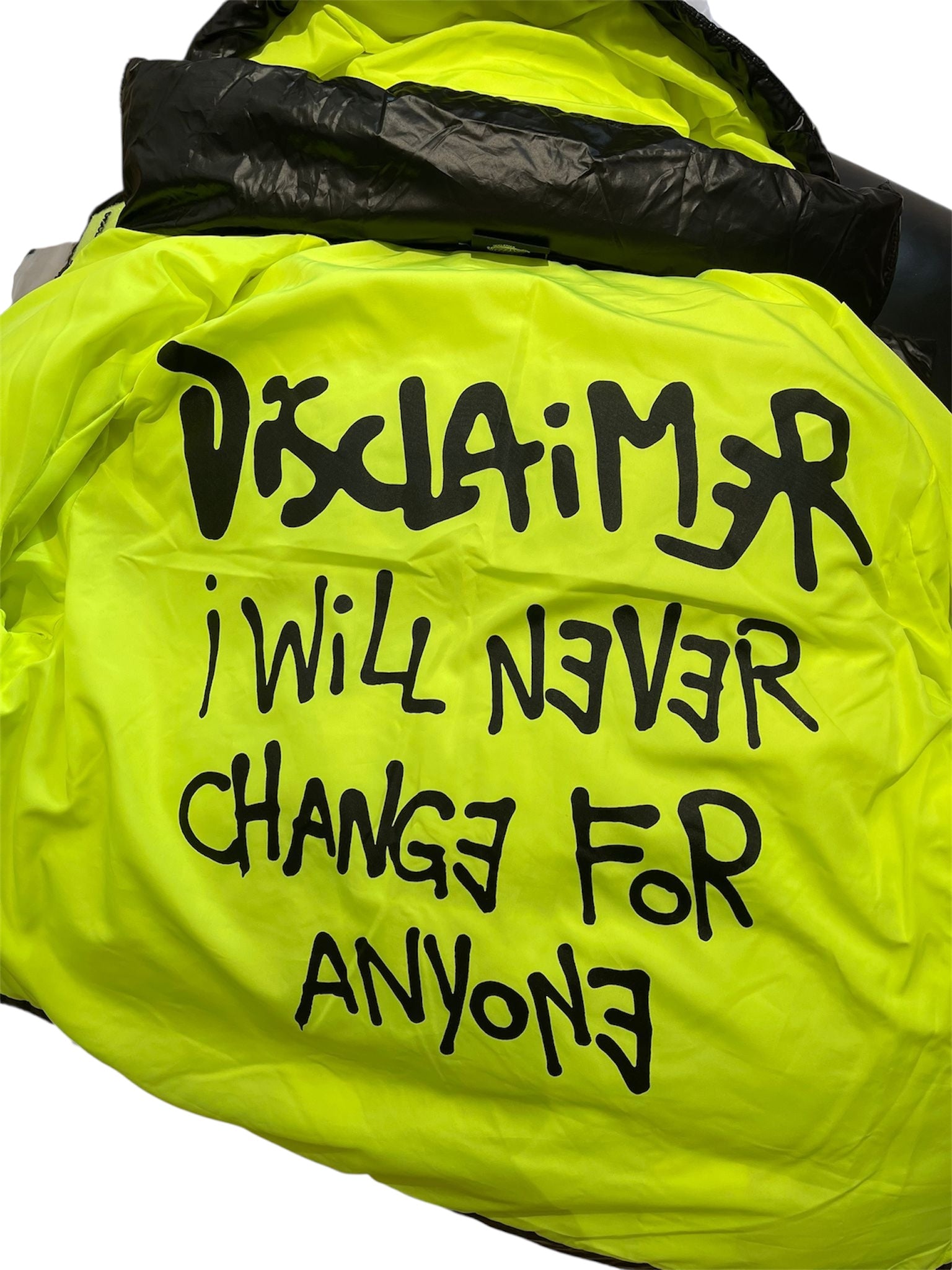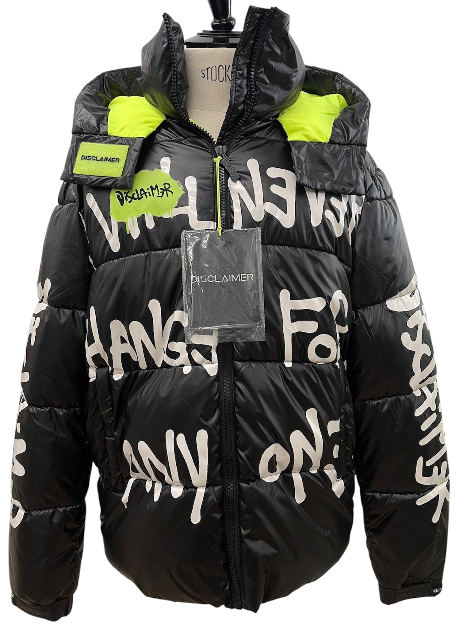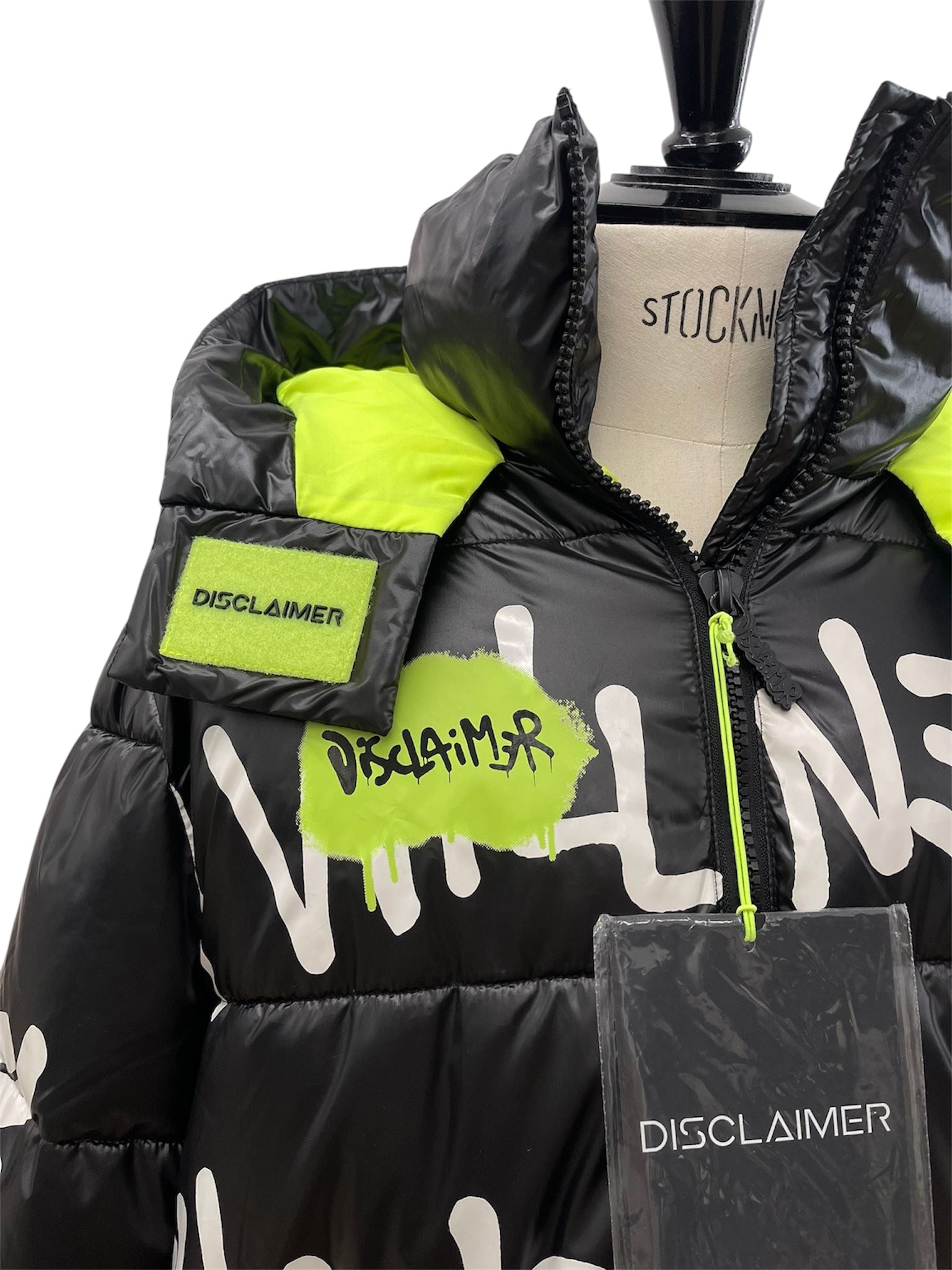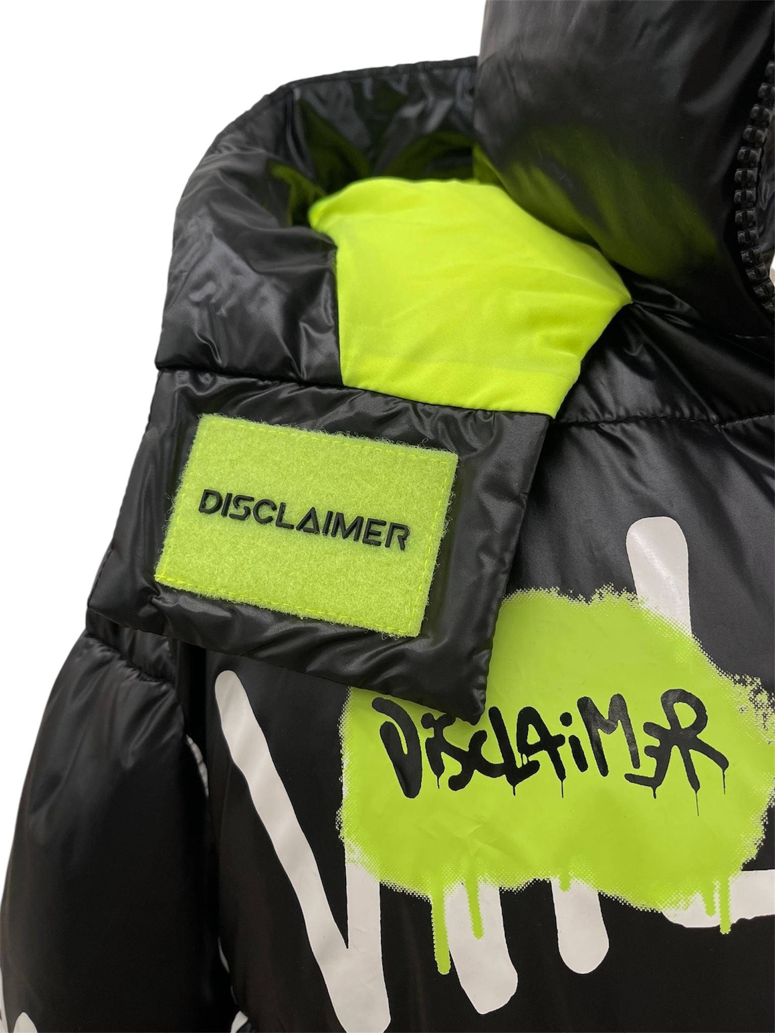 Un piumino invernale dal forte carattere street, firmato Disclaimer. La base nera lucida è arricchita da scritte bianche effetto graffiti e da dettagli fluo che donano energia e originalità.