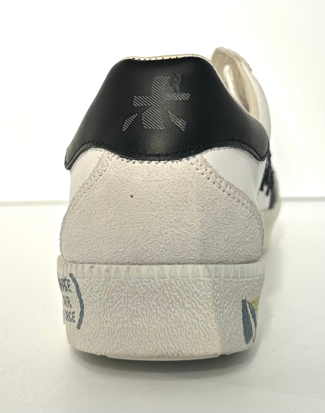 Contrasto Black & White: La tomaia in pelle bianca è vivacizzata dall'iconico logo Premiata laterale e dalle due bande diagonali in pelle nera con bordi seghettati, che conferiscono un tocco grafico e grintoso.