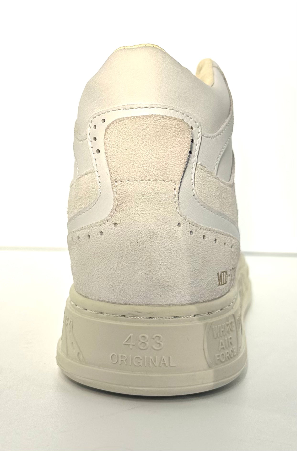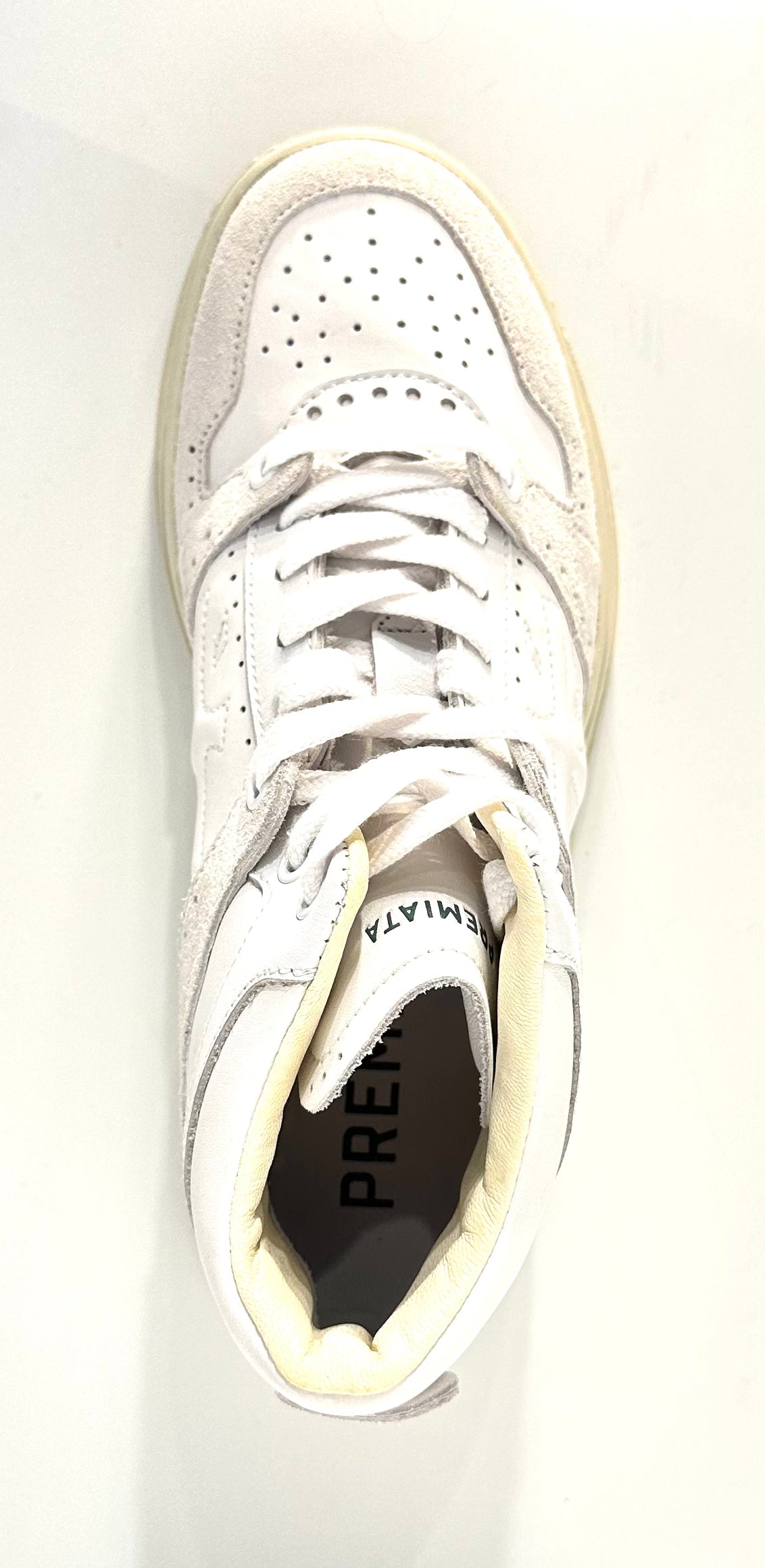 Suola Platform Grafica: La suola "cupsole" color crema riprende i toni della tomaia e presenta le iconiche stampe e scritte Premiata, donando un tocco artistico e inconfondibile.
