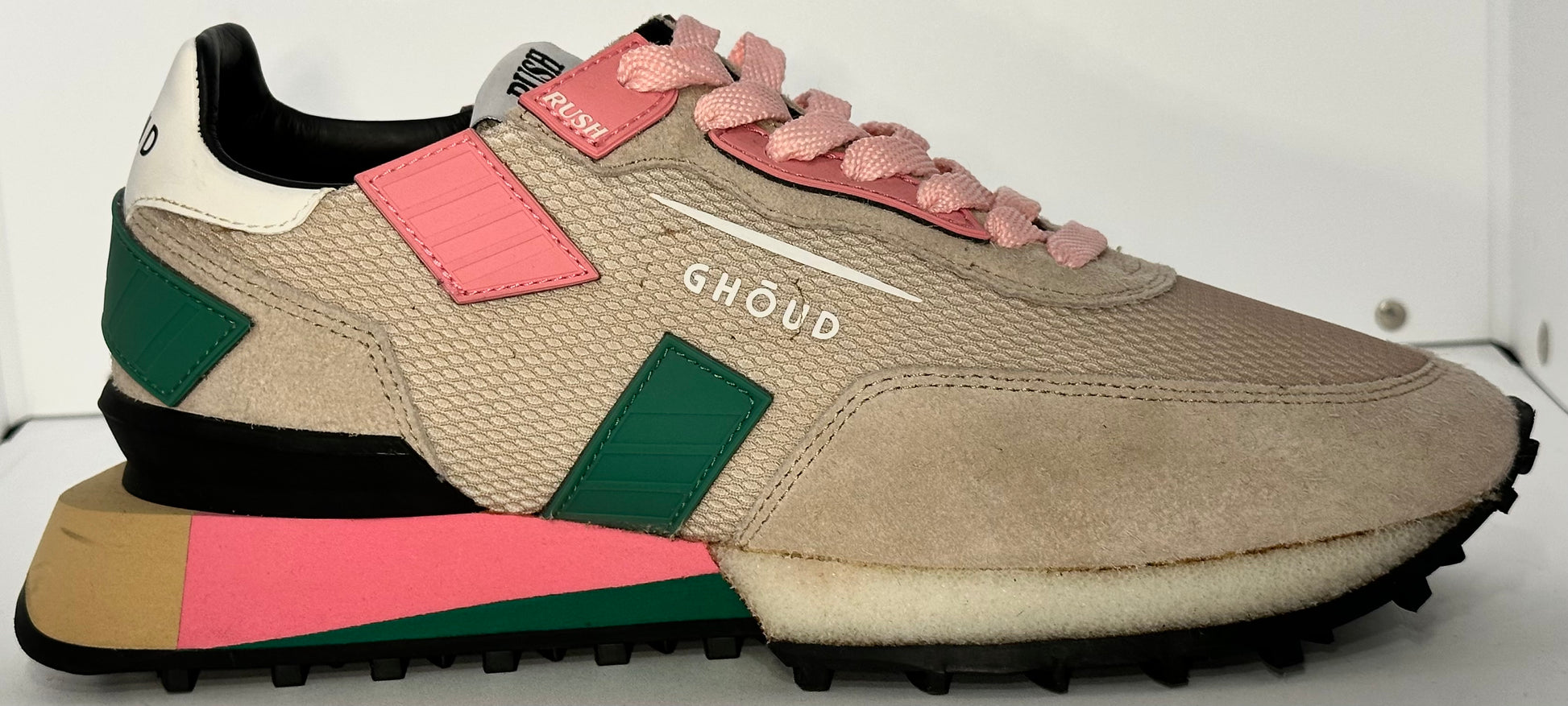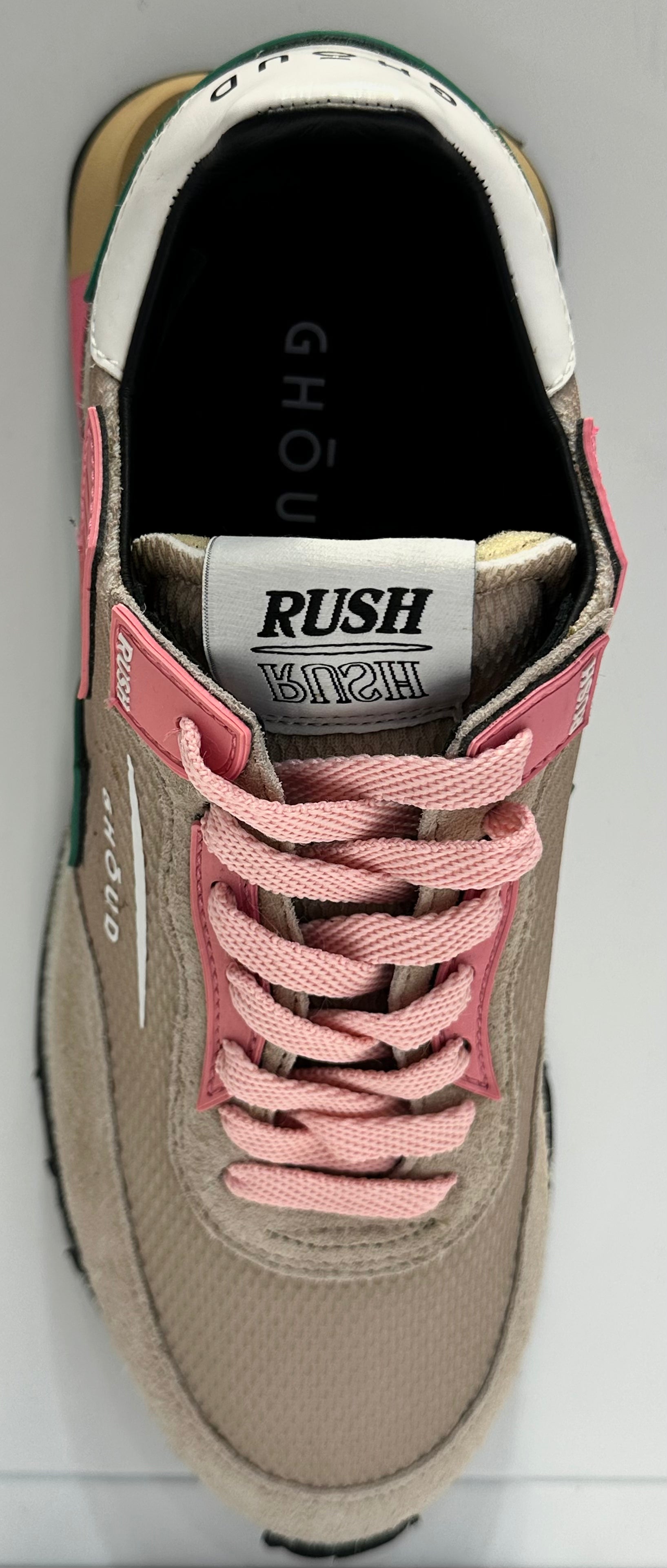 La suola color crema, dalle linee dinamiche, offre comfort e stabilità, mentre il logo GHŌUD stampato lateralmente conferma l’identità esclusiva del brand. Un modello versatile che unisce stile e funzionalità, ideale per chi cerca una scarpa da indossare ogni giorno con un tocco di eleganza contemporanea.
