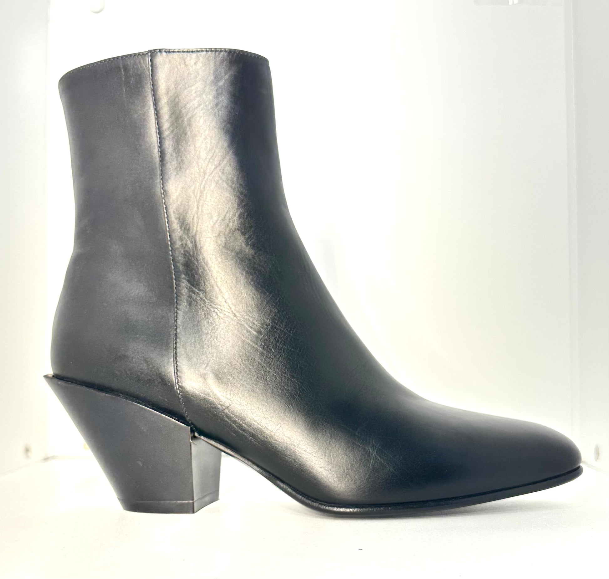 Realizzato in morbida pelle di vitello liscia, l'Allyk reinterpreta il trend western in chiave urbana. Il punto di forza è l'iconico tacco scultoreo di 7 cm (stile cubano rivisitato), che slancia la figura garantendo una camminata stabile e confortevole. La silhouette affilata con punta tonda e la chiusura con zip laterale interna assicurano una calzata pratica e impeccabile.