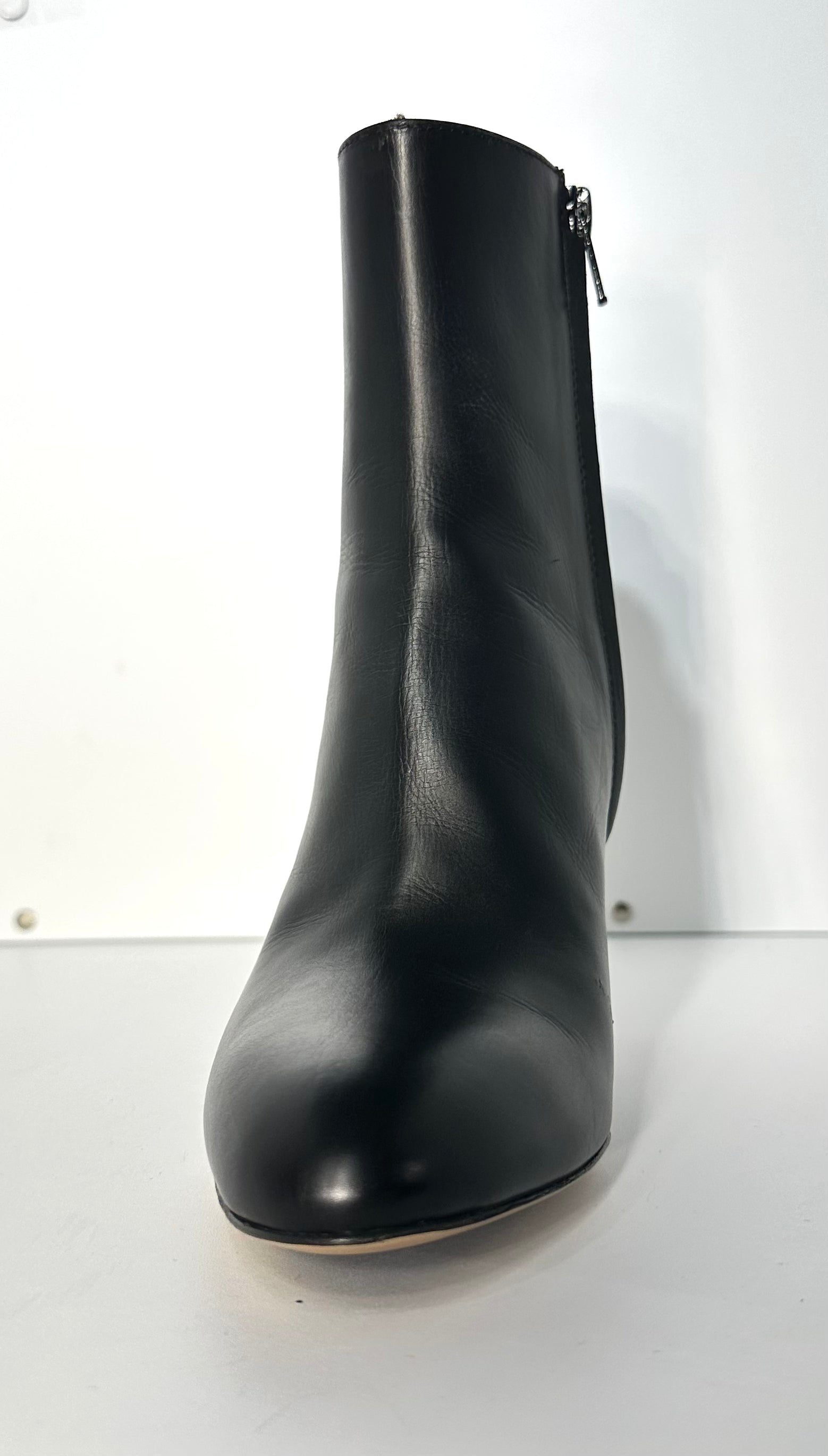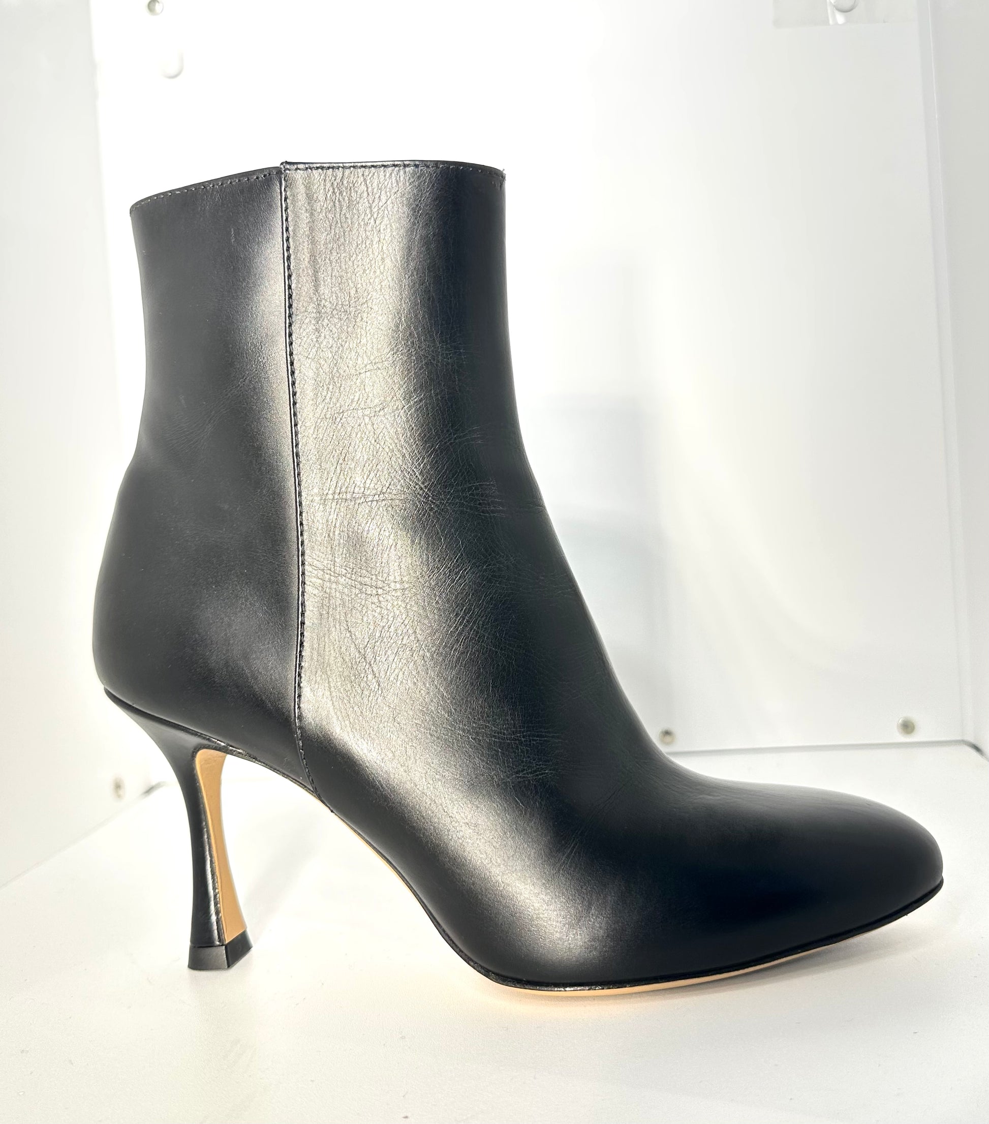 Realizzato in pregiata pelle di vitello nero, questo stivaletto si distingue per la sua silhouette affusolata e pulita. Il vero protagonista è il tacco a spillo scultoreo, con una base leggermente svasata che aggiunge un tocco di design moderno a una forma classica, garantendo al contempo un appoggio più sicuro rispetto ai tacchi a spillo tradizionali.