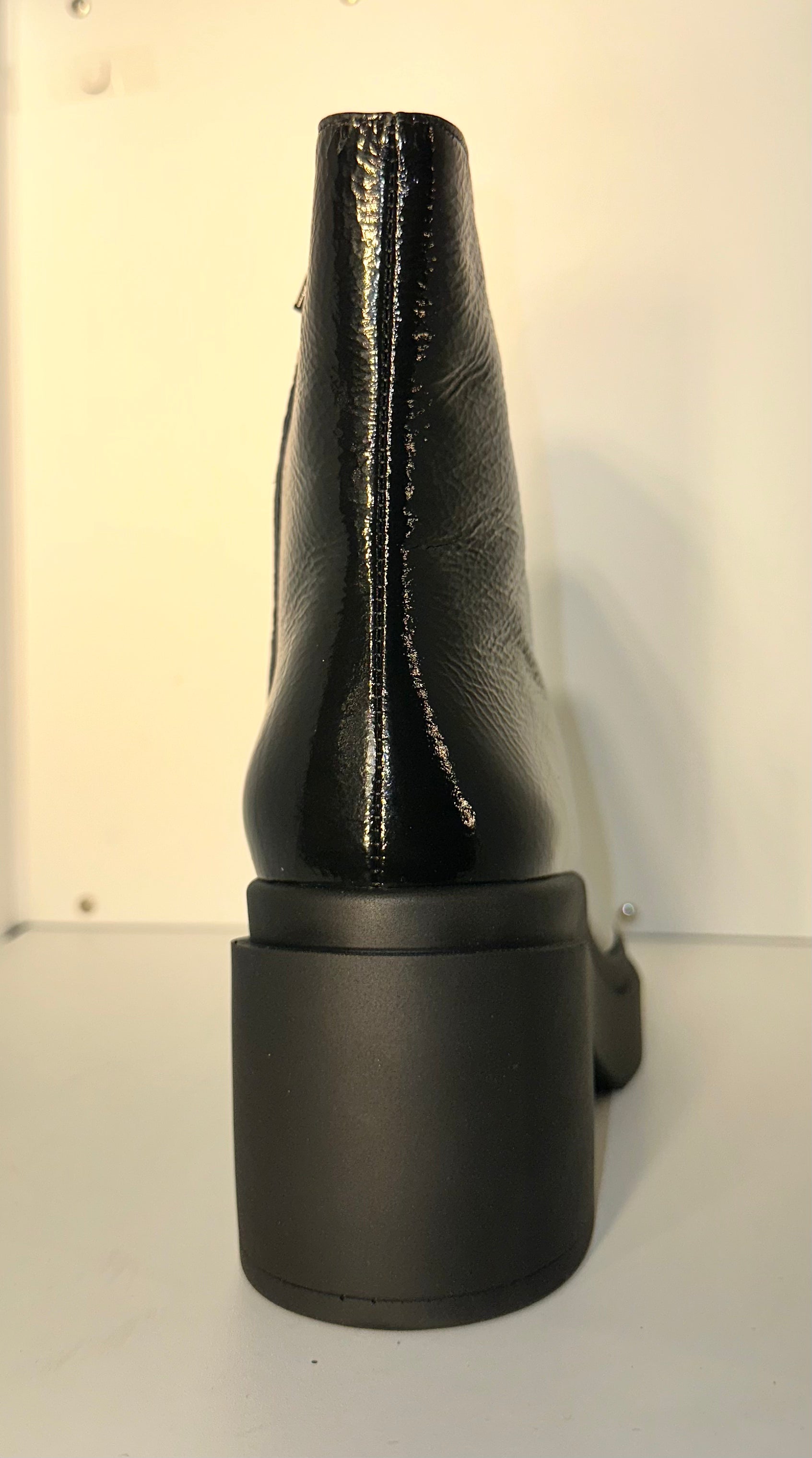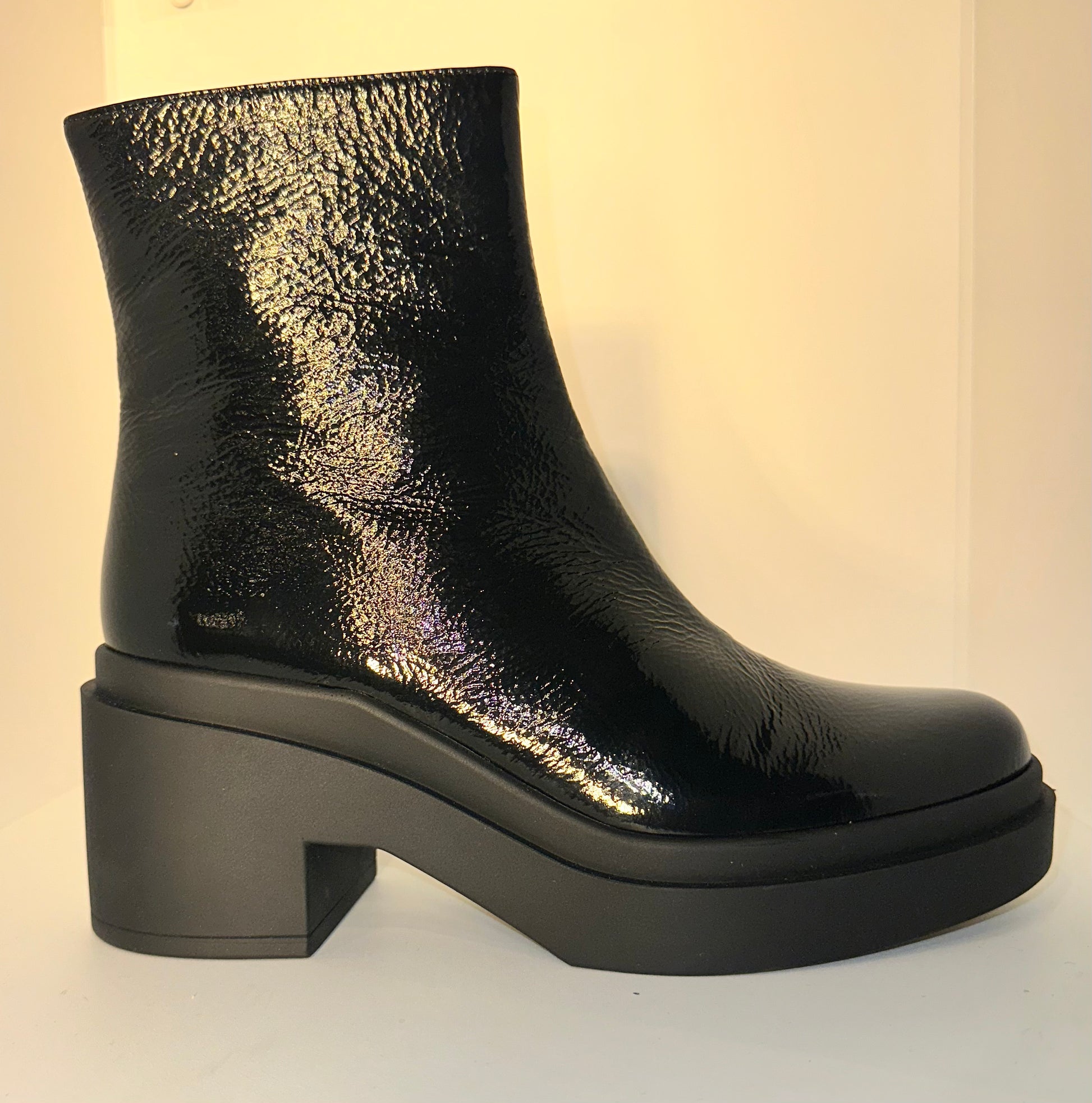 Grinta, luce e carattere si fondono nel modello Chloe di Roberto Festa. Questo stivaletto è la scelta definitiva per chi desidera un accessorio d'impatto: la finitura nero lucido (effetto vernice stropicciata) cattura la luce a ogni passo, trasformando un design minimalista in un vero e proprio statement di moda.